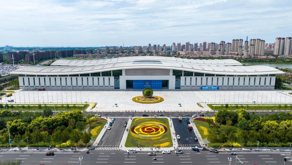 这是8月28日拍摄的2025年上海合作组织峰会主会场外景(无人机照片)。 新华社记者 赵子硕 摄