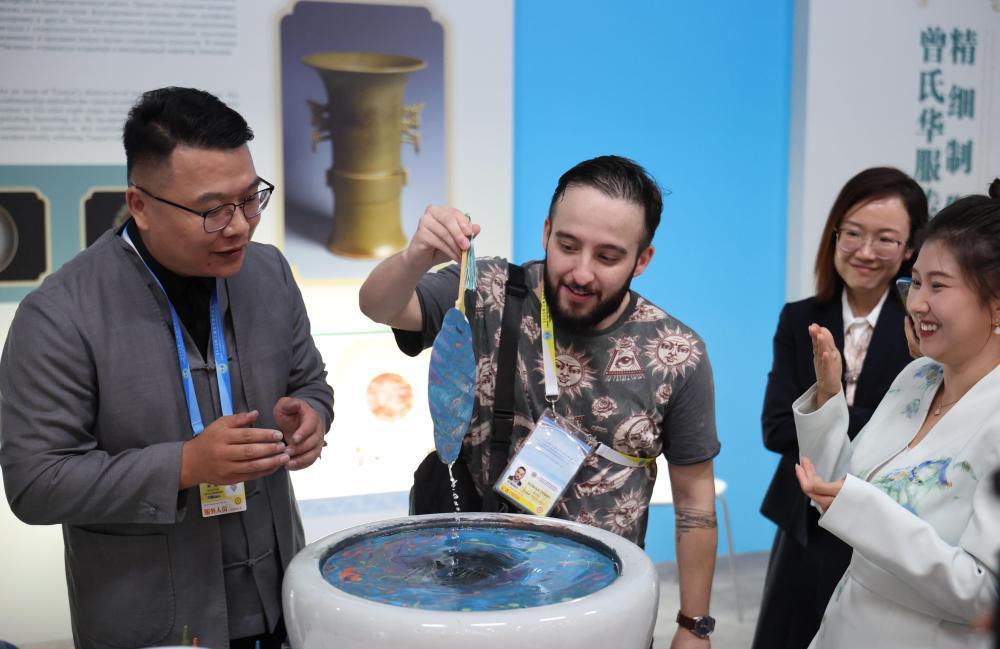 8月29日,在2025年上海合作组织峰会新闻中心,外籍记者(左二)体验制作漆扇。 新华社记者 杨青 摄