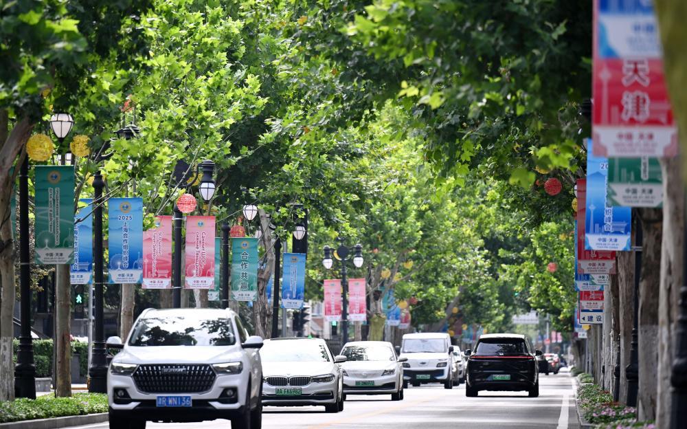 天津市和平区泰安道沿街悬挂峰会道旗(8月28日摄)。 新华社记者 赵子硕 摄