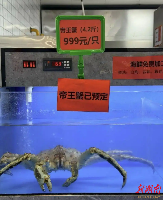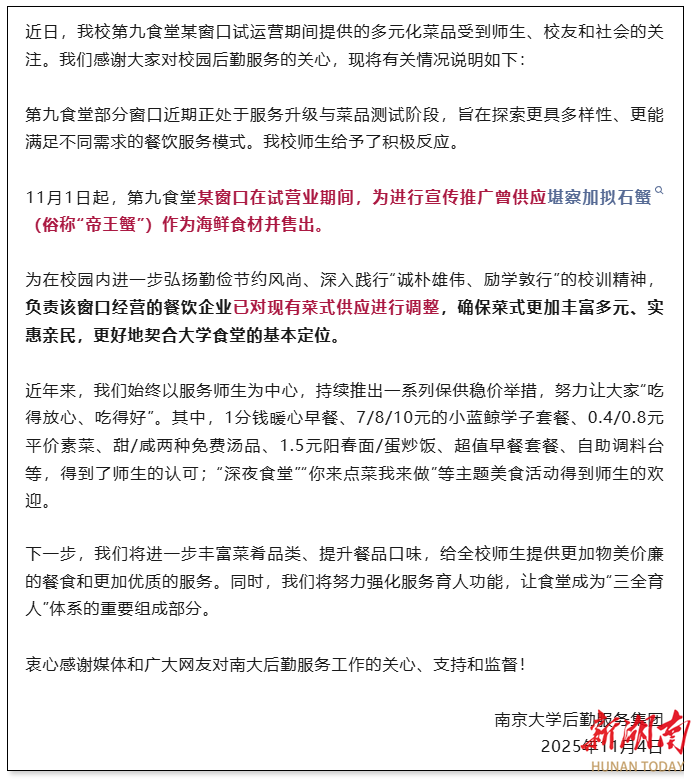 湖南日报11月5日讯(全媒体记者 刘镇东)11月1日,“南京大学食堂售999元帝王蟹”词条冲上热搜,当4.2斤重的鲜活帝王蟹以999元的标价出现在该校仙林校区第九食堂价目表上时,这只“天价螃蟹”吸引了不少网友关注。