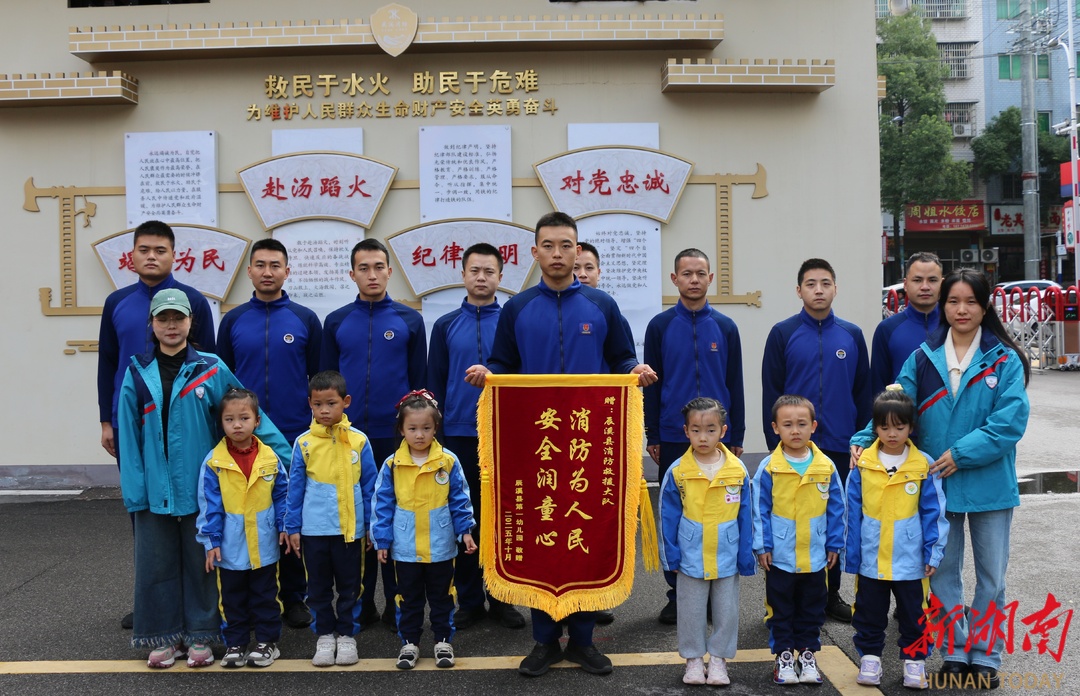 湖南日报·新湖南客户端11月5日讯(通讯员 赵艳)11月5日,辰溪县第一幼儿园负责人带领6名小朋友走进辰溪县消防救援大队东星消防救援站,将一面绣有“消防为人民、安全润童心”的锦旗送到消防救援人员的手中,对全体消防救援人员表达了感谢。