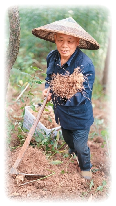 在湖南欣竺生态农业科技有限公司的黄精养殖基地,农户向记者展示刚挖出来的黄精。