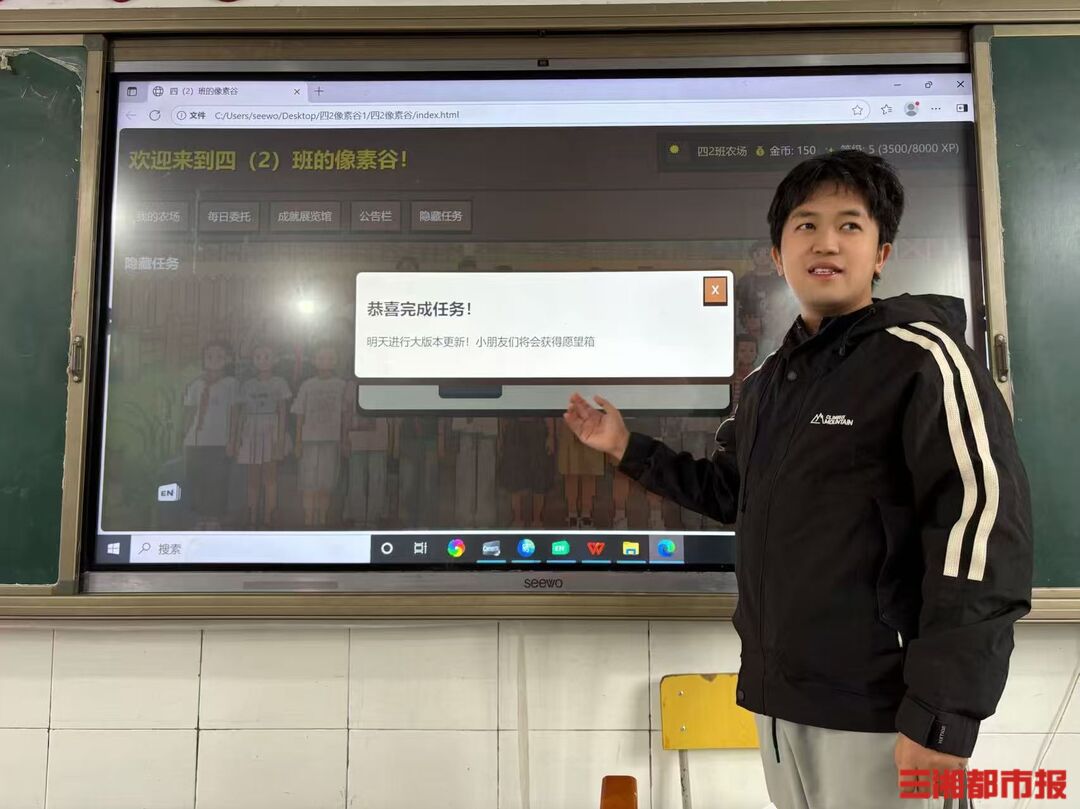 李翔设计的“游戏化教学系统”融合了多种学生熟悉的游戏机制,借鉴《星露谷物语》的任务模式,将每日数学题变成委托任务,学生完成即可获得“种子”与“资源”;引入《和平精英》的“段位”体系,让整个学期成为一场不断升级的段位赛;参考热门网游的宝箱机制,使课堂表现可以兑换“开箱”机会,用随机奖励带来持续的新鲜感。“我不是在单纯做游戏,而是在构建一个孩子们愿意主动探索的学习情境。”李翔说。