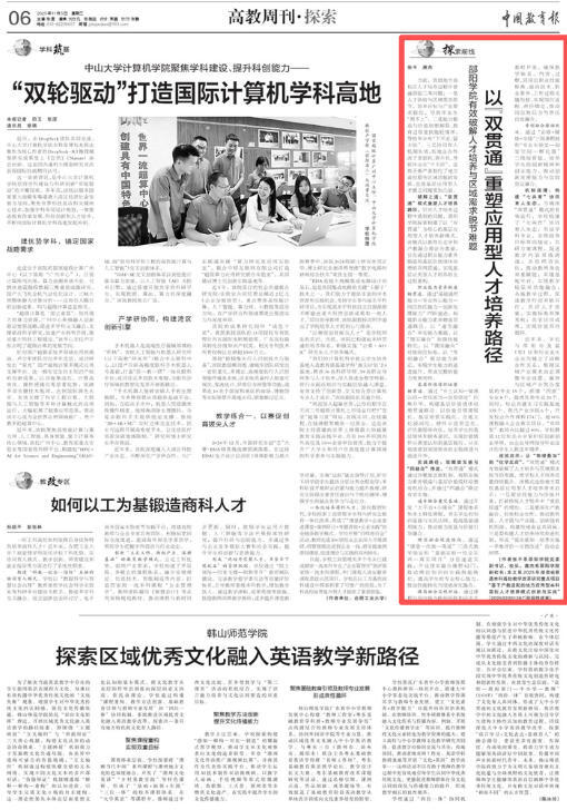 成效启示:从“物理叠加”到“化学反应”。“双贯通”模式有效破解了人才培养与区域需求脱节的难题,使学校人才培养质量持续提升。该模式也给地方高校基层应用型人才培养带来启示:一是要坚持能力与价值并重,打破传统人才培养中“重技轻道”的惯性。二是要深化产教融合、校地校企合作,推动教育链、人才链与产业链、创新链有机衔接,构建校地命运共同体,三是要构建人才培养持续改进机制,形成“需求感知一培养实施一多维评价一反馈改进”的动态闭环。