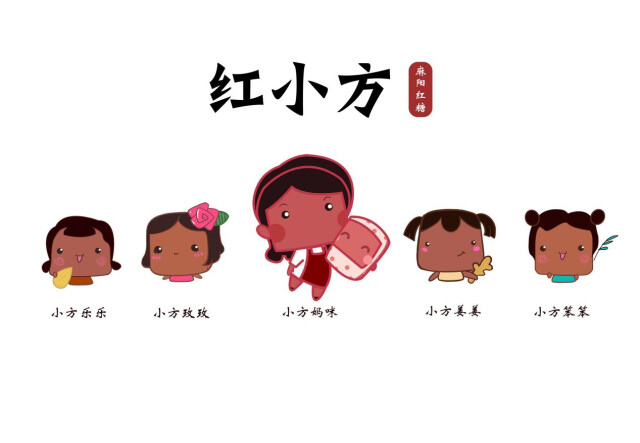 IP形象如何设计呢?做一个妈妈的方脸,带四个小孩。“小方妈咪”即主产品红糖,“四个小孩”即四个衍生产品(生姜红糖“小方姜姜”、玫瑰红糖“小方玫玫”、草本红糖“小方乐乐”、坚果红糖“小方笨笨”)。以一个和谐甜蜜的“糖族”,依偎在朴实的牛皮盒装为基础,策划形成高品位的“红小方”品牌体系。