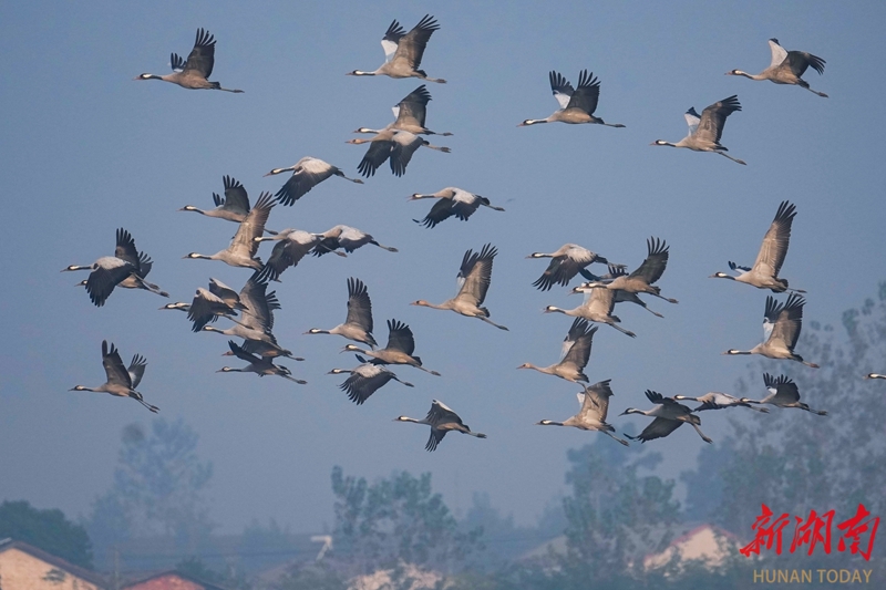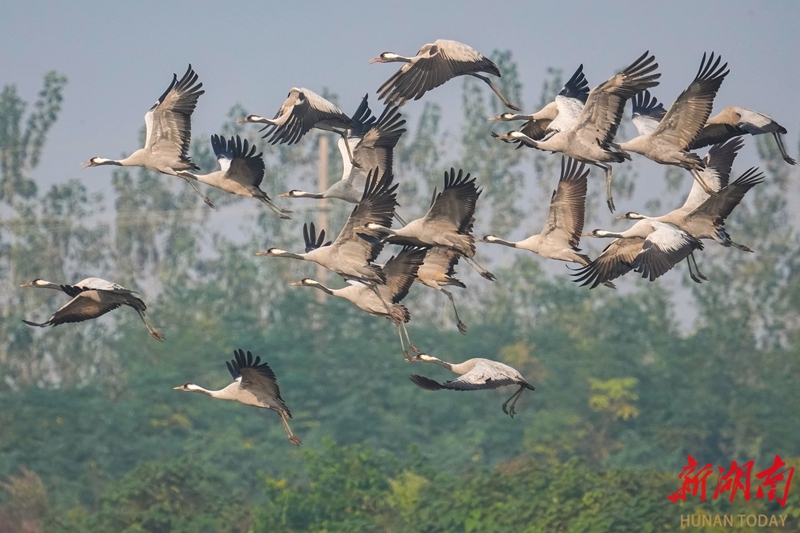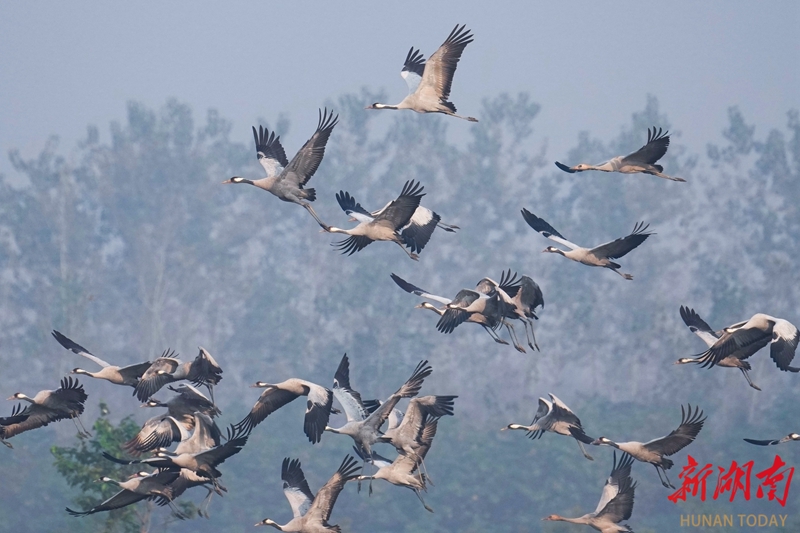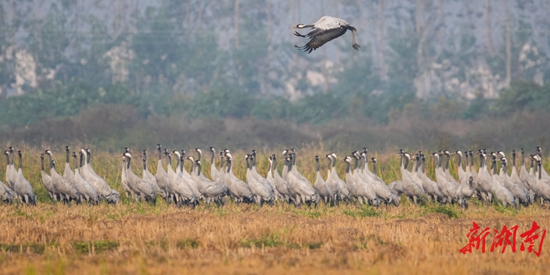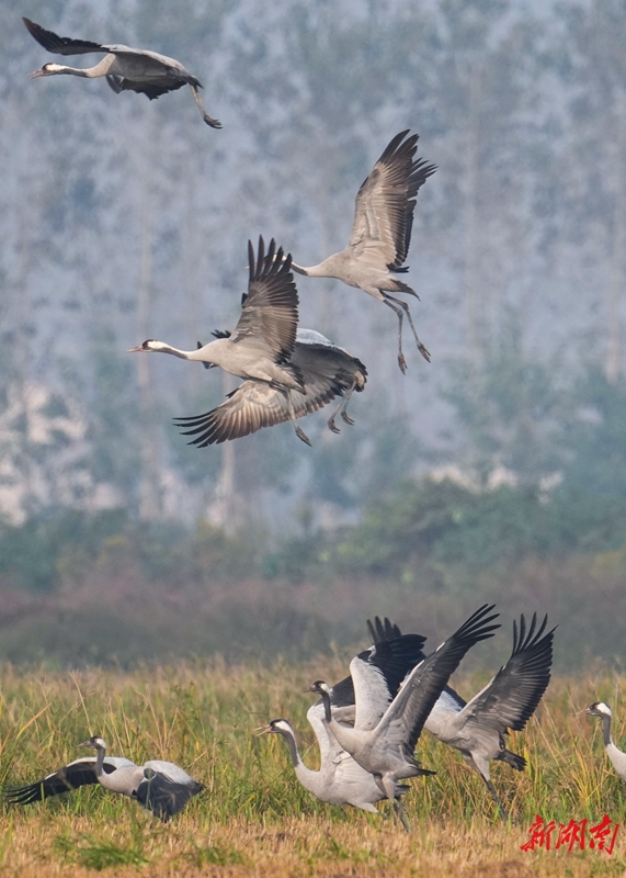 11月5日,岳阳市屈原管理区凤凰乡,成群灰鹤时而低头觅食,时而振翅嬉戏,构成一幅灵动的自然画卷。立冬将至,屈原管理区陆续迎来大规模南迁候鸟。宋政军 摄(湖南图片库)