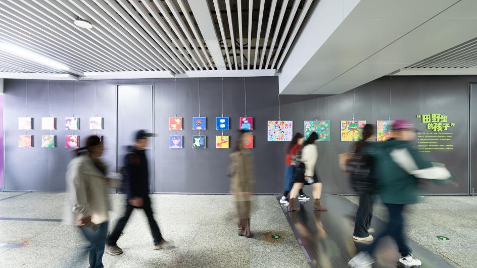 溁湾镇地铁站的换乘通道也变身为一条“三分钟艺术长廊”,墙面展出的童画、剪纸等儿童艺术作品以纯真笔触勾勒出童心的世界,未经修饰的真诚表达与天马行空的想象,打动过往乘客,在匆忙通勤中收获片刻宁静。