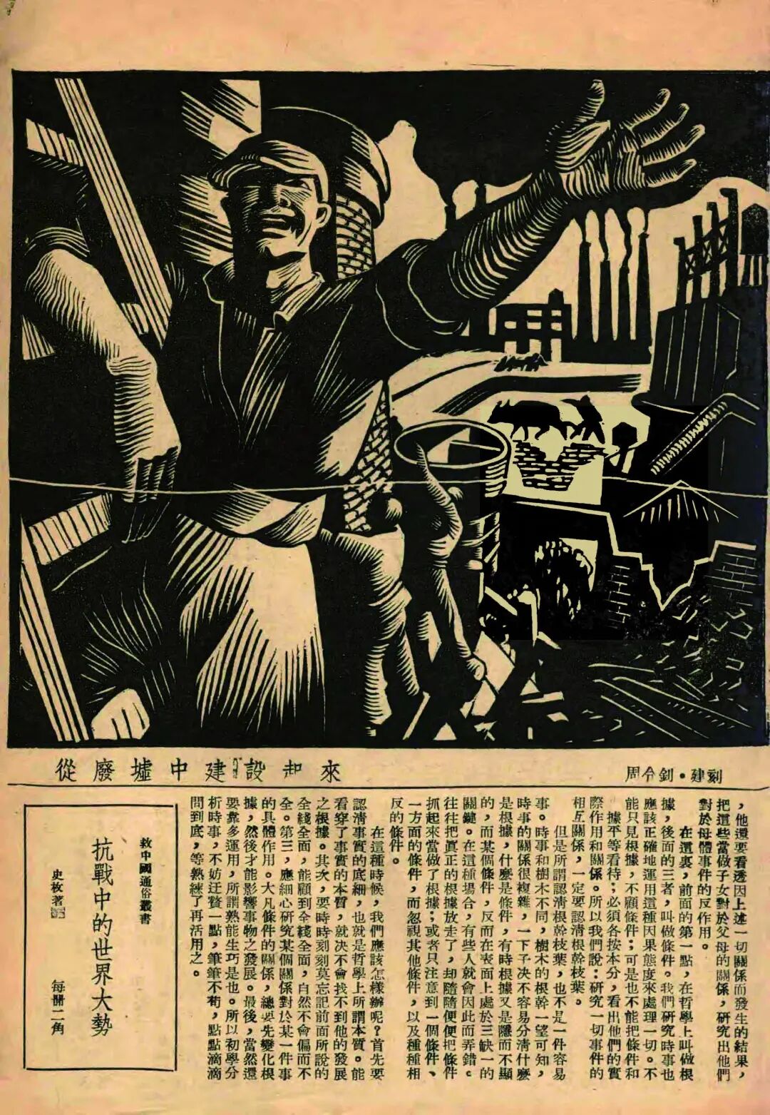 周令钊 《从废墟中建设起来》木刻版画 1939年展厅里,一张照片展示了周令钊参与绘制的黄鹤楼城壁大壁画《全民抗战》。