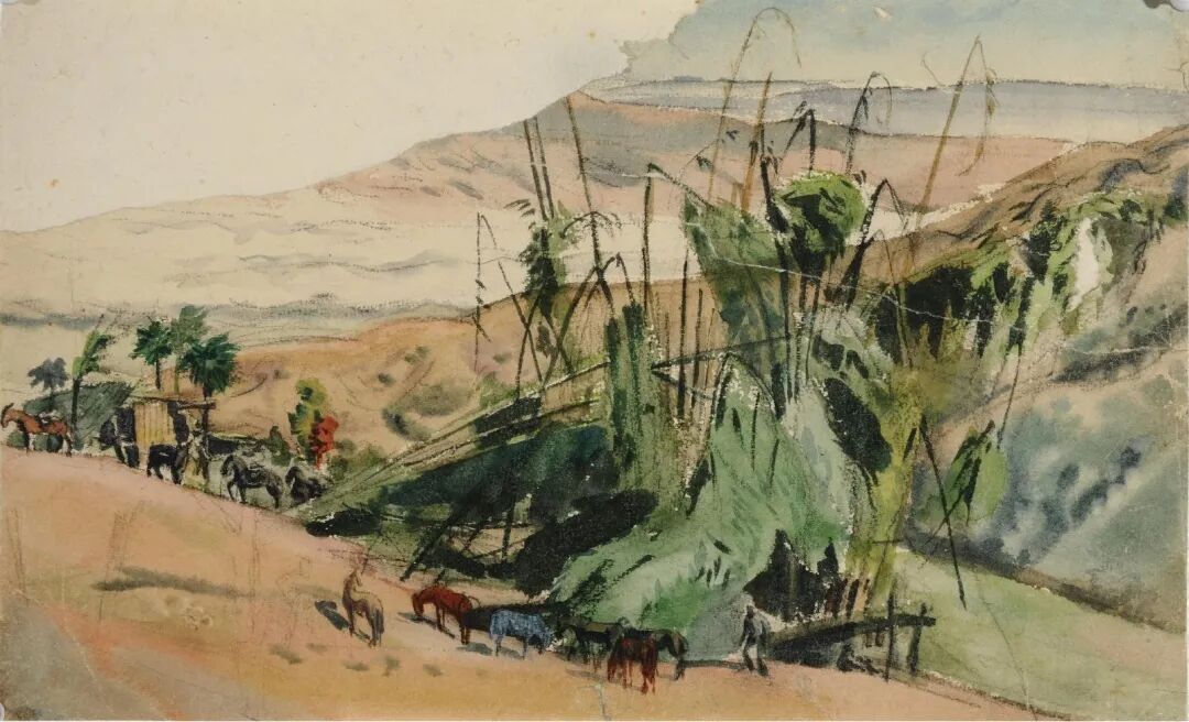 周令钊 《云南芒市》纸本·水彩 29.2×19.3cm1944年展厅里的一块展板,清晰勾勒出他的烽火足迹。武汉、上海、广州、桂林、昆明……大半个中国都留下了他的身影。