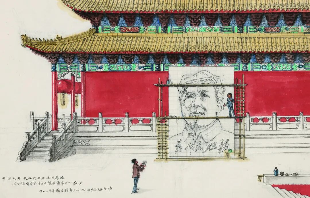 周令钊 《回忆开国大典毛主席画像绘制现场》1949年,30岁的周令钊接到一项重托:为开国大典绘制天安门城楼毛主席画像。6.2米长、4.8米宽的巨像,相当于两层楼的高度,彼时既无专业升降机,也无照片放大设备。他请工作人员在天安门城楼上搭起脚手架,凭着抗战时画大壁画的经验,用“打格放大法”将小照片上领袖的面容一笔一笔“搬”上马口铁皮做的画板上。