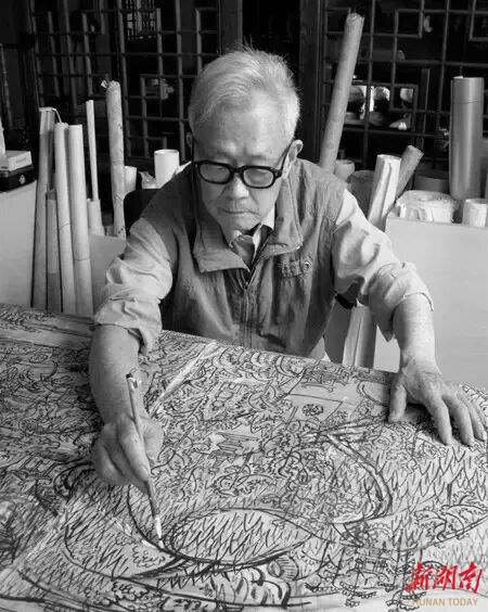 “父亲在哪里都能画。”周容领着大家看向一张老照片。照片上,正值1994年,周令钊在岳阳一处临时住所里,创作石刻壁画《沅江水暖》《澧水花繁》,画案只是一张窄窄的桌子。