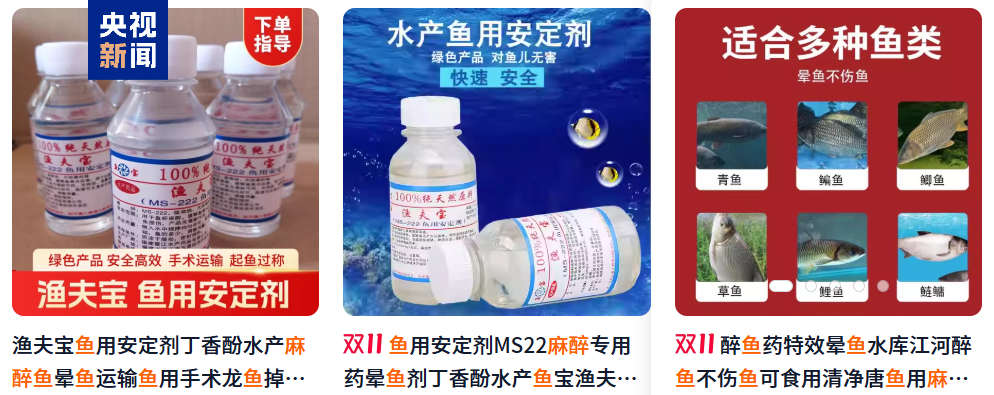 在各大短视频平台和电商网站的介绍中,“鱼麻药”有“鱼安定”“渔夫宝”等不同名称,部分产品号称“只需一滴,鱼儿任你摆布”,但其有效成分均为丁香酚。