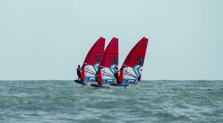10月30日,浙江队选手闫铮(右)在第十五届全运会帆船项目女子水翼帆板级比赛中。新华社记者 晋美多吉 摄
