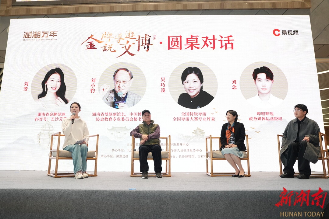 在圆桌对话环节,湖南省博物馆原副馆长刘小豹、全国特级导游吴巧凌、B站平台文博板块负责人刘念分别就《“破圈”:新媒体时代如何讲好文博故事》《“出圈”:金牌导游如何助力打造文博爆款》、《“圈粉”:如何让更多年轻人爱上文博》三大主题展开深度分享,探索文博传播的新路径。