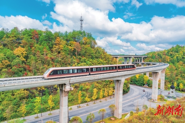 11月4日,凤凰县沱江镇齐良桥村,游客搭乘凤凰磁浮观光快线,沿途饱览层林尽染的醉人秋景,感受“车在画中行”的独特体验。梁永鸿 摄(湖南图片库)