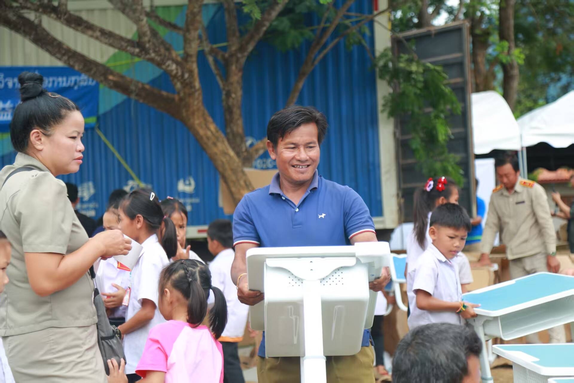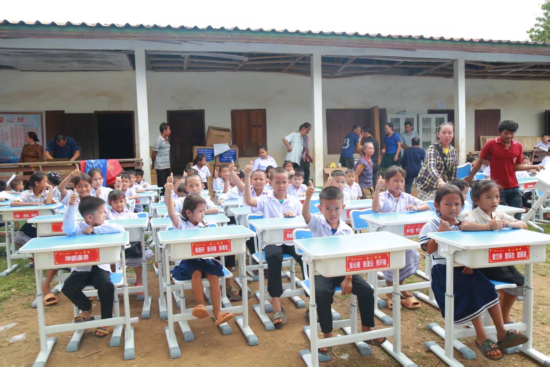 “感谢中国志愿者带来的温暖!”勐丰县委书记坎佩·詹松普带领县党政负责人、各界人士及全校师生家长,周末专程到场迎接。看着教室里整齐排列的新桌椅、教具,师生们脸上洋溢着灿烂笑容,纷纷用不太流利的中文说着“谢谢”。志愿与孩子们交流,细致了解学校现状与需求,探讨后续援助方向。