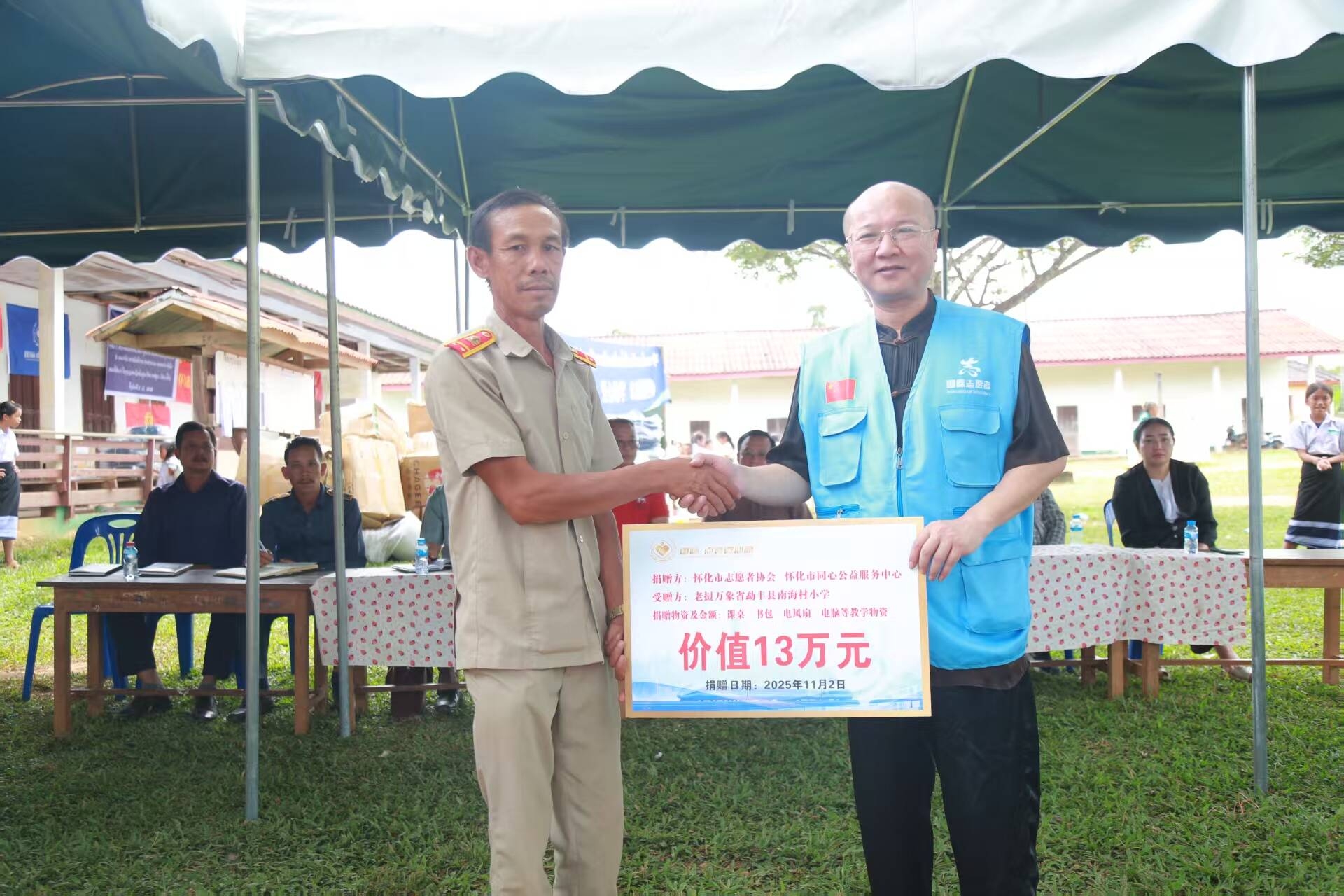 这是怀化市志愿者协会对南海村小学的满满爱心。去年11月,8名志愿者初访时,简陋的校舍与孩子们的纯真笑容深深烙印在他们心中。“一定要为孩子们改善学习条件!”回国后,怀化市志愿者协会、市同心公益秉持“爱心无国界”理念发起公益行动,1238位个人和相关企业迅速响应,13万元教学物资在短时间内筹集完毕。今年7月,这批承载着中国爱心的物资从怀化国际陆港出发,搭乘“怀化—万象”国际货运班列直达目的地,中通国际的运费优惠、功喜成自然资源发展有限公司的全程协助,为这场跨国公益保驾护航。