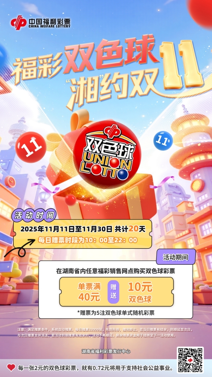 福运双伴,幸运随行。11月11日至11月30日,湖南“福彩双色球 ‘湘’约双11”赠票活动暖心开启,让爱心和惊喜相伴。