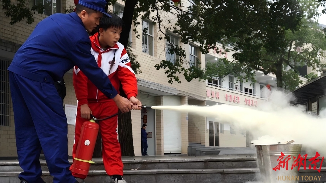疏散演练结束后,该校还邀请了怀化市洪江区消防救援大队的消防员,为全体师生进行了一场生动的消防安全知识技能培训。消防员用通俗易懂的语言,向师生们讲解了如何预防校园火灾,如何正确报火警,以及身处火场如何自救逃生等基本常识。在专业人员的指导下,部分学生代表进行了干粉灭火器实操演练。他们按照“提、拔、握、压”的四字口诀,对准模拟火源进行喷射,成功将“大火”扑灭。这一环节让师生们零距离接触消防、体验消防,掌握了灭火器的正确使用方法。