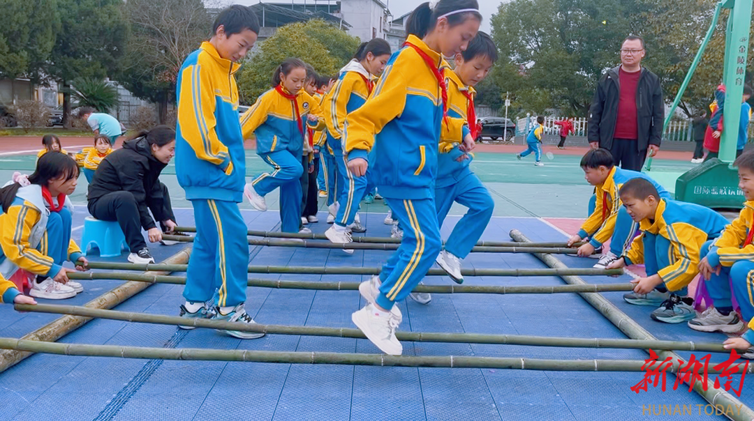 跑操环节中,各班踩着鼓点,以方阵形式围绕大小操场有序行进。压轴登场的是五六年级学生带来的竹竿舞,随着竹竿的开合敲击,学生们灵巧跳跃,民族特色与运动活力赢得全场阵阵掌声。