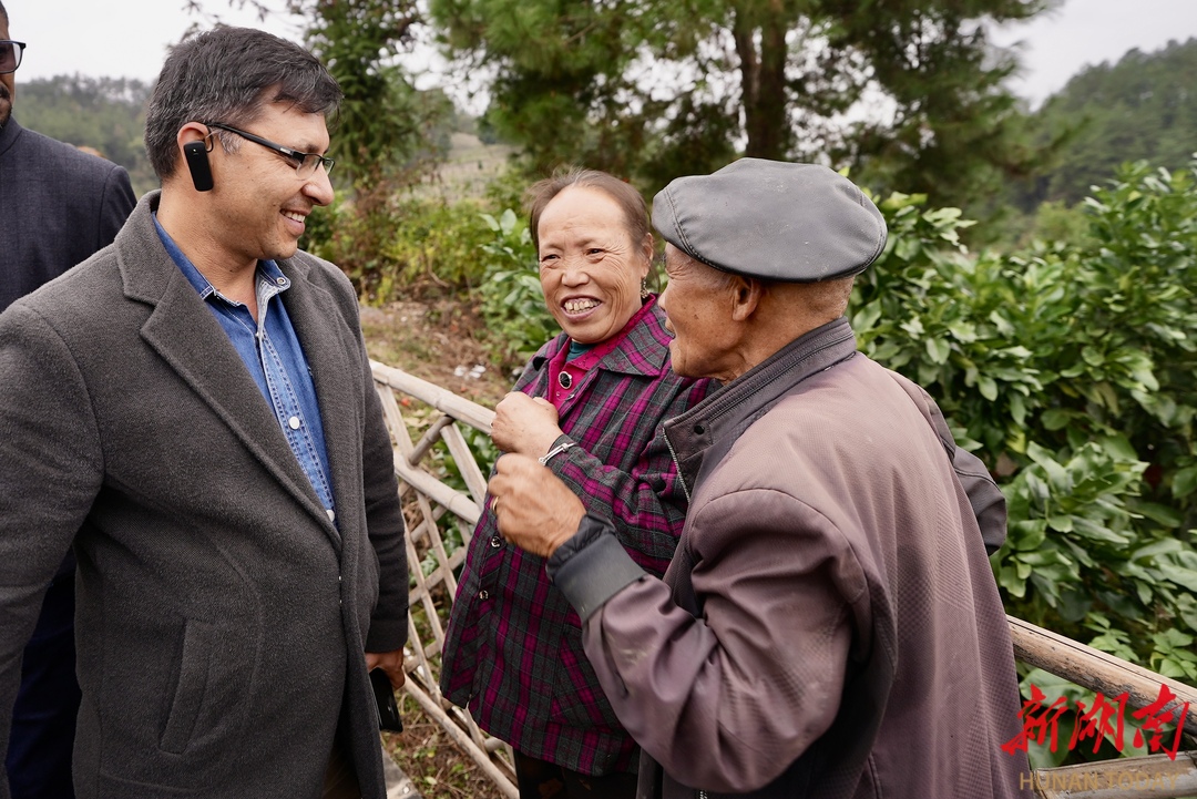 在凤凰县菖蒲塘村,外宾们实地考察了当地依靠科技育种、延伸产业链、促进农旅融合发展推进乡村振兴的实践模式。中非共和国代表团成员格朗古尔说:“湖南的实践经验令人钦佩,我亲身感受到这里的乡村之美。回国后,我一定把在湖南的见闻广泛传播。”