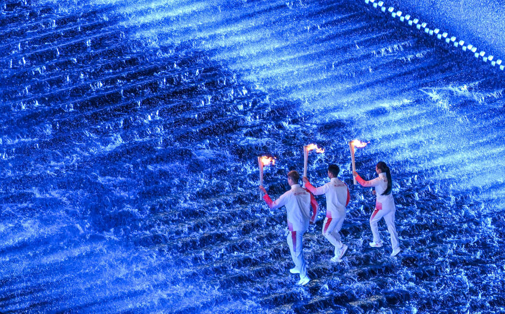 火炬手在开幕式现场传递火炬。新华社记者 李鑫 摄