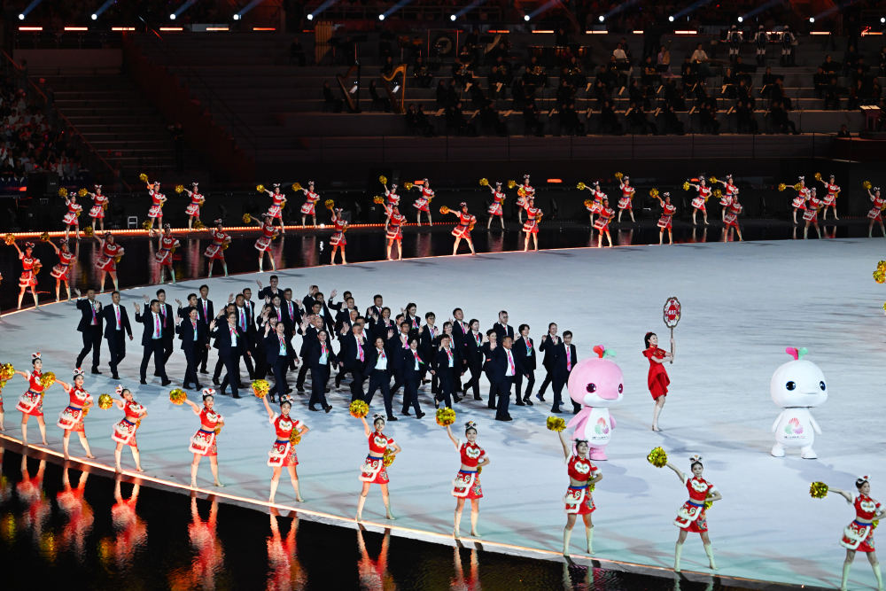 广东省体育代表团、香港特别行政区体育代表团、澳门特别行政区体育代表团在入场仪式上共同入场。新华社记者 黄伟 摄