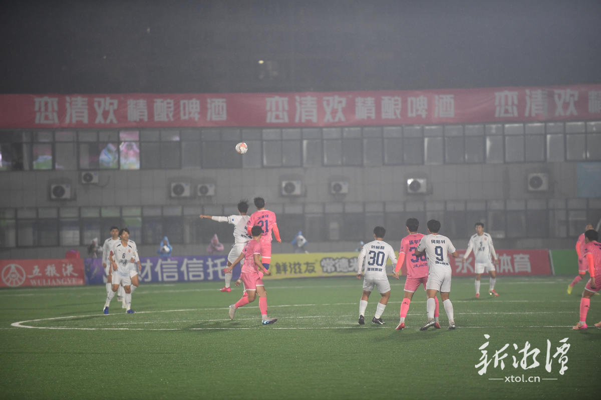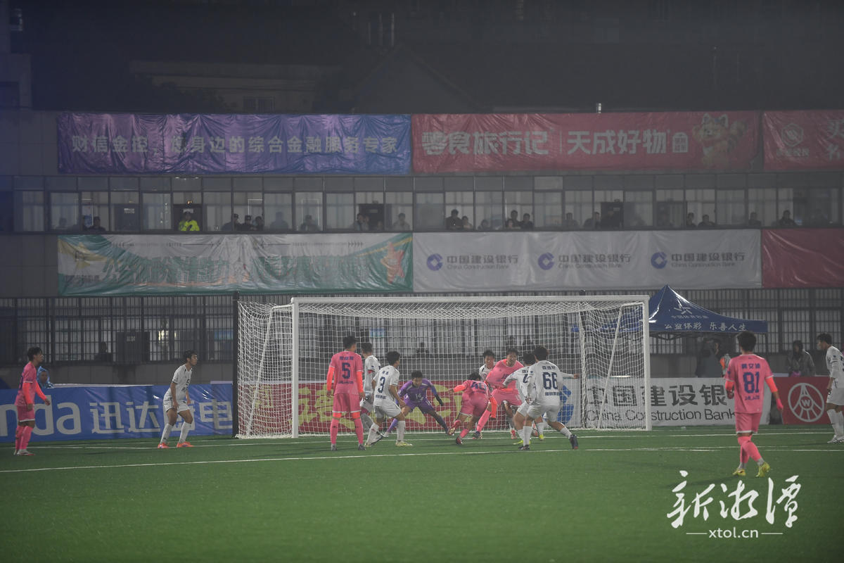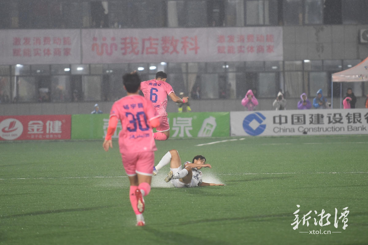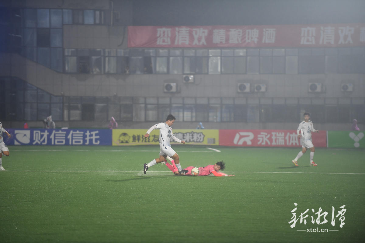 比赛在雨中拉开大幕,湿滑的场地对双方技战术发挥都造成了一定影响。比赛一开始,志在必得的常德队就大举压上,几名后卫甚至压到了中线附近。湘潭队则摆出稳守反击的姿态,全队通过积极的跑动和顽强的拼抢耐心寻找机会。