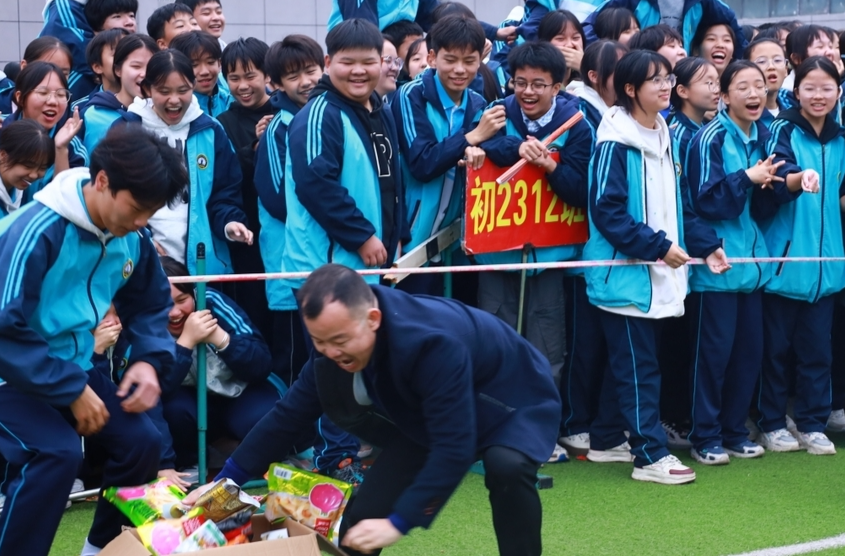 活动现场,薯片、巧克力等零食堆起“甜蜜小山”,哨声一响,班主任们迅速切换状态,有的挂满零食变身“移动零食仓”,摇晃奔跑引得全场爆笑。