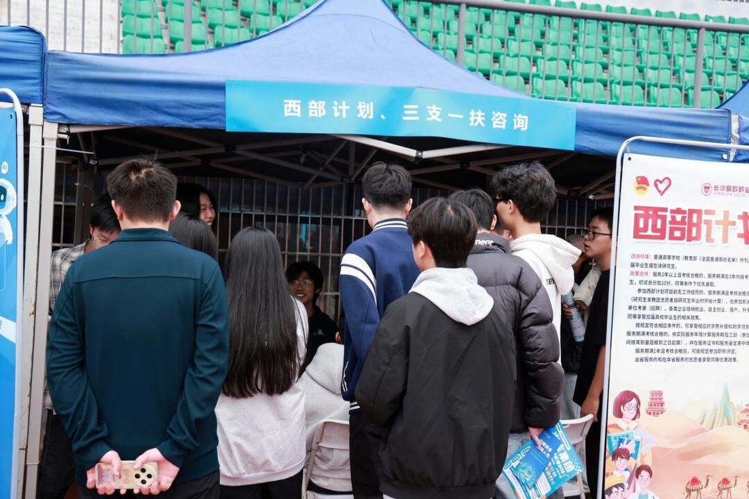除传统招聘展位外,现场还特别设置了“就业创业政策咨询区”“应征入伍宣传区”及“西部计划与三支一扶咨询区”,邀请雨花区人社部门、井湾子街道香樟路社区和学校保卫部、团委等相关工作人员驻点答疑,为毕业生提供涵盖创业补贴、社保政策、入伍流程、西部计划报名条件等“一站式”咨询服务,引导困难群体毕业生拓宽就业路径,积极投身基层治理、乡村振兴与国防建设。