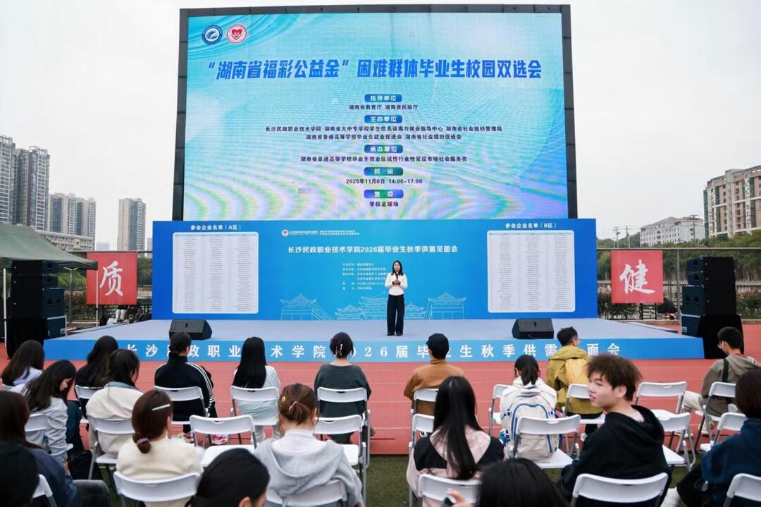 为充分发挥高校毕业生就业区域性行业性常设市场的辐射带动作用,切实帮扶困难群体毕业生尽早实现高质量充分就业,11月6日,由省教育厅、省民政厅指导,长沙民政职业技术学院、湖南省大中专学校学生信息咨询与就业指导中心、湖南省社会组织管理局、湖南省普通高等学校毕业生就业促进会联合主办,湖南省普通高等学校毕业生就业区域性行业性常设市场(社会服务类)承办的“湖南省福彩公益金”困难群体毕业生校园双选会在长沙民政职业技术学院足球场举行。