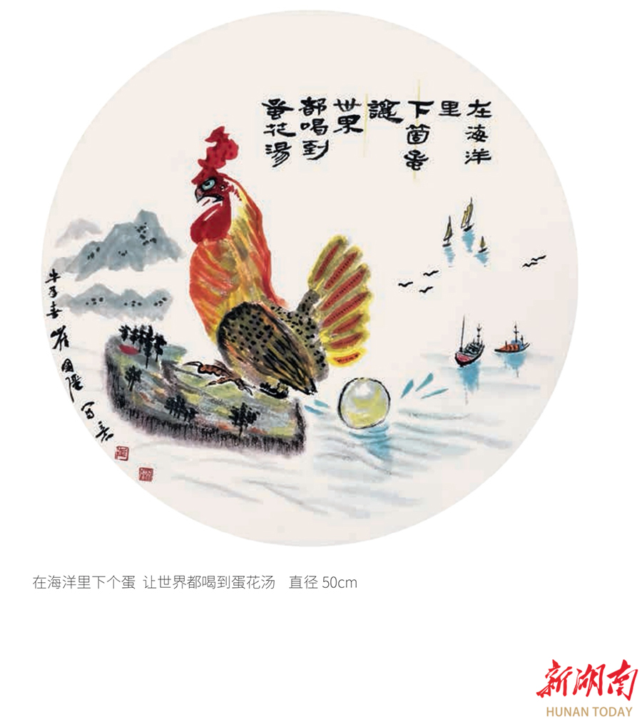 更让我觉得有趣又温暖的,是“在海洋里下个蛋,让世界都喝到蛋花汤”,画中一只公鸡昂首挺胸,仿佛正完成一件了不起的事,题字充满天马行空的想象力。这幅画让我懂得,乐观不是硬扛苦难,更是保有对生活的热爱与奇思妙想。就像我在学习之余,也该保留一份童真与创意,用积极的心态把平凡的日子过得有滋有味。