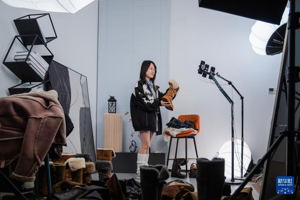11月10日,在浙江省温州市瓯海区的一家网络科技公司,主播通过网络直播销售鞋子。“双十一”来临,各地电商和快递企业工作人员忙着销售、发货,一派繁忙景象。新华社发(刘吉利摄)