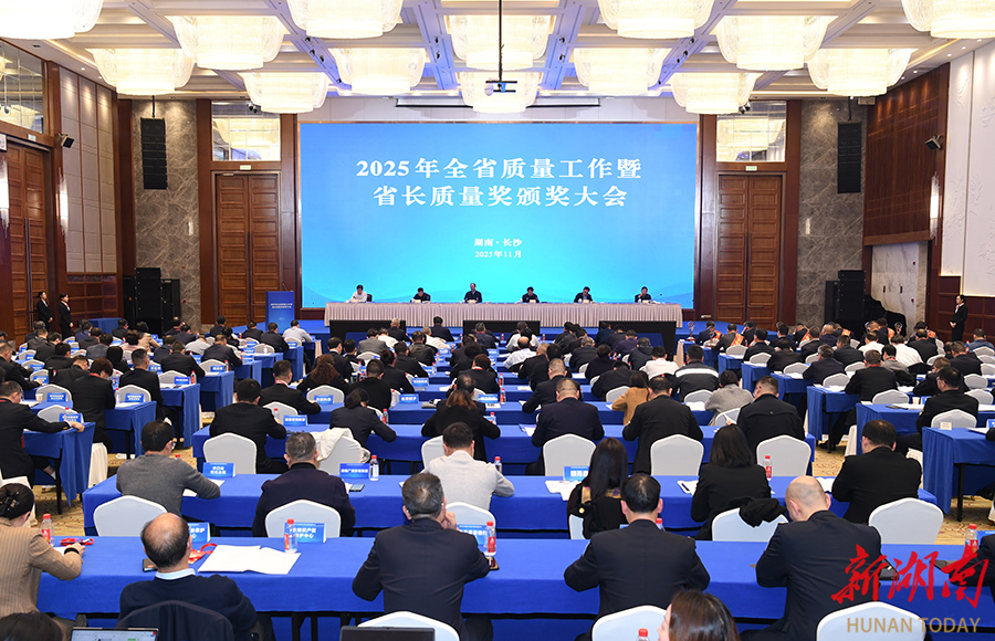 11月10日,2025年全省质量工作暨省长质量奖颁奖大会在长沙召开。会上,发布并表彰了第八届湖南省省长质量奖获奖单位。雪天盐业、华锐精密等7家组织荣获省长质量奖,九典制药等8家组织获省长质量奖提名奖。湖南日报全媒体记者 田超 摄