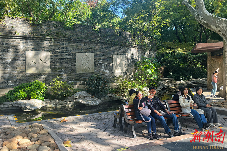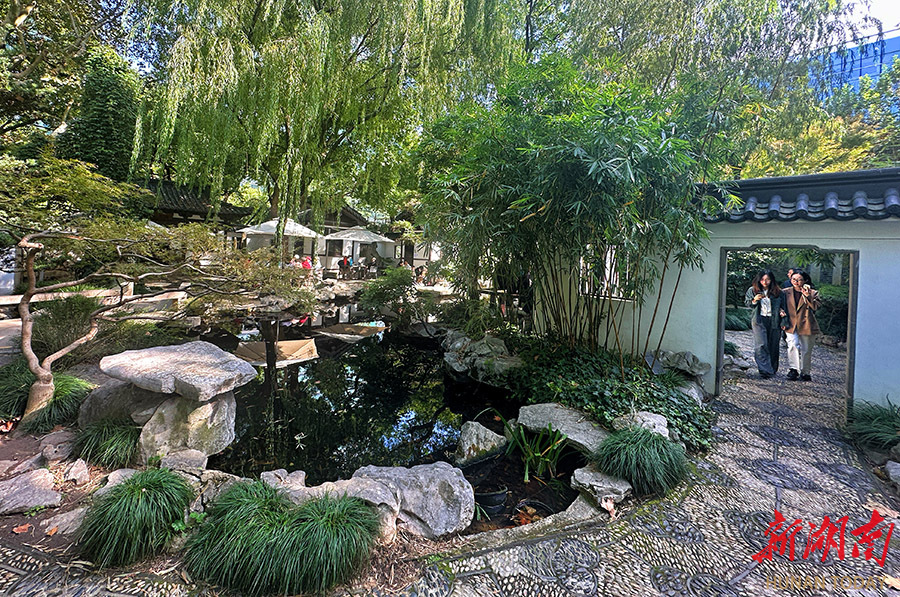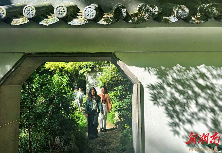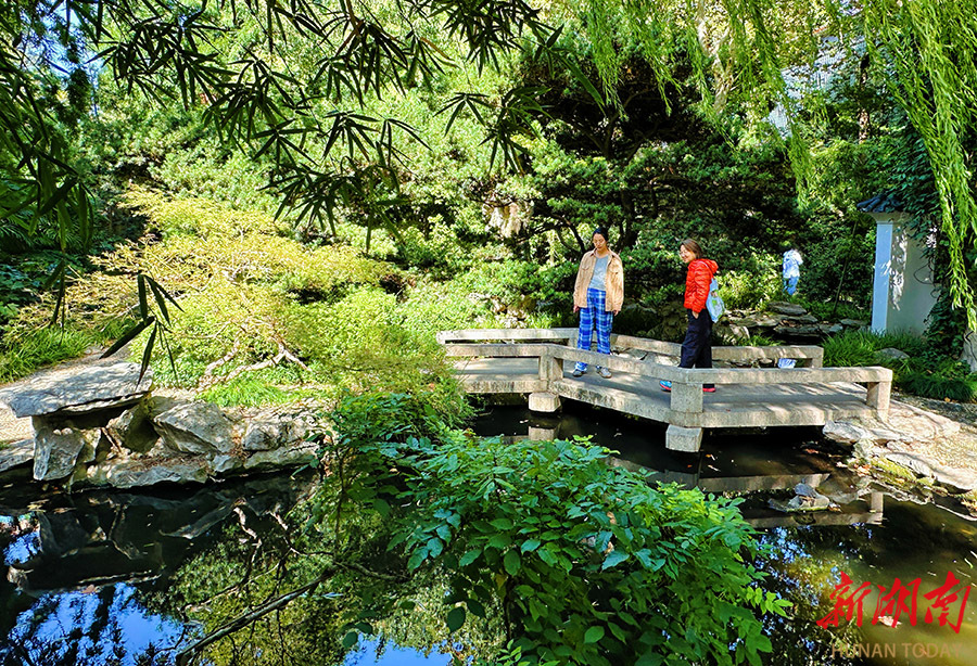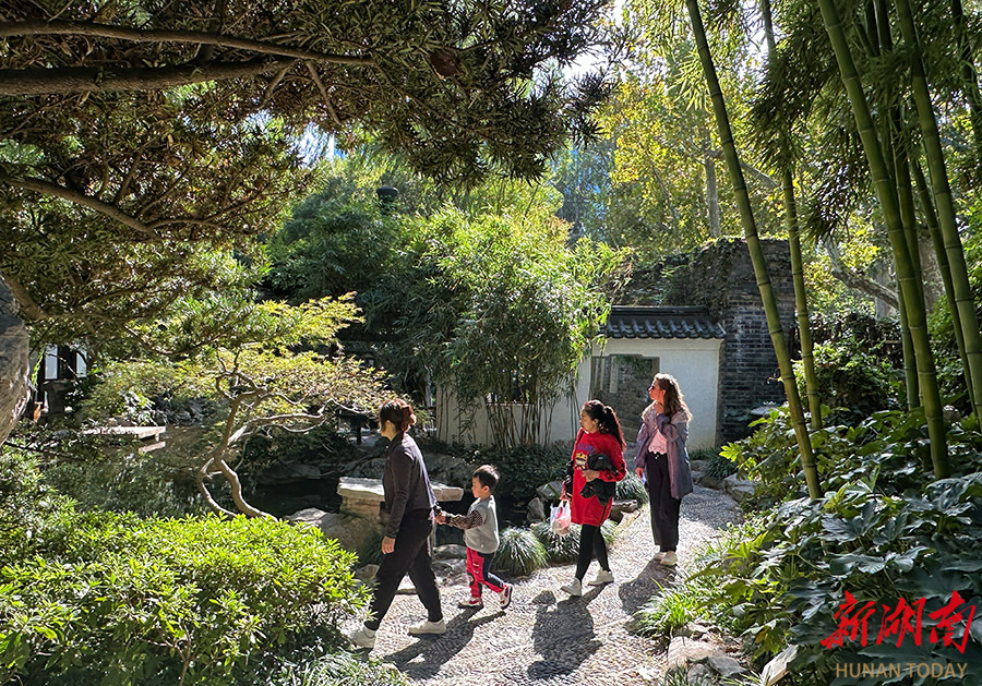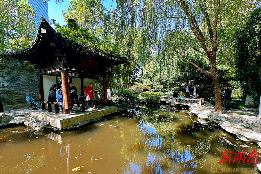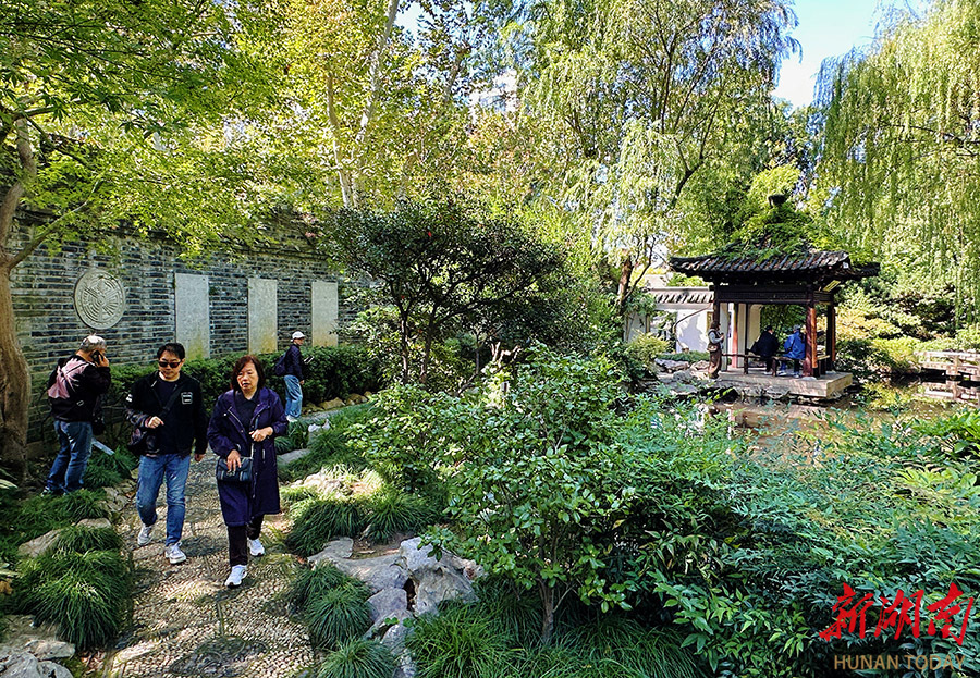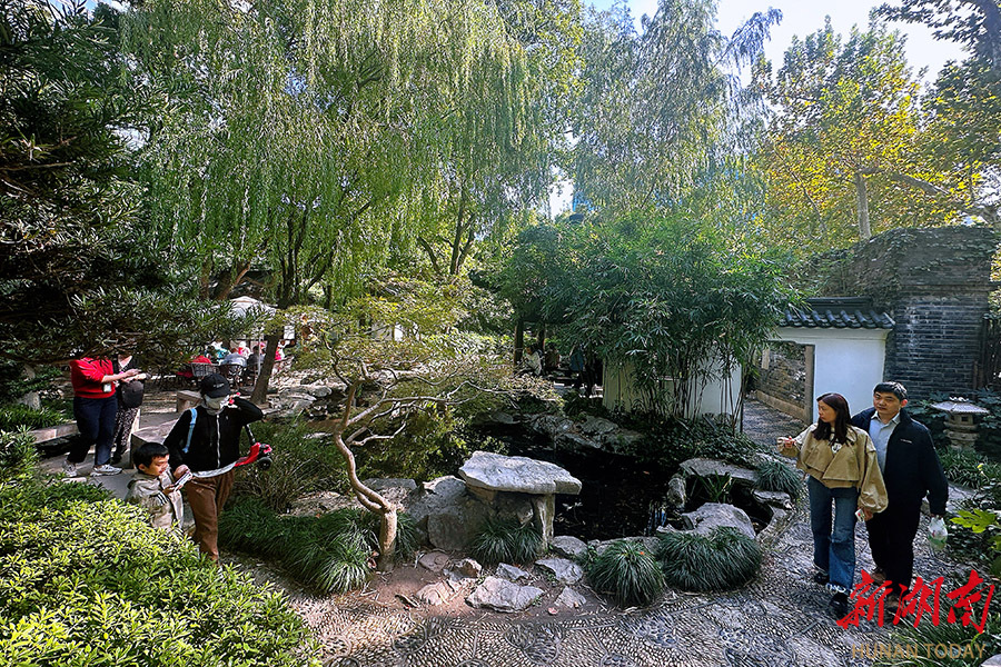 11月10日,游客在上海静安八景园休闲游玩。该园以“静安八景”为蓝本,通过传统造园手法再现历史风貌,曲桥浮水、古松翠竹等元素营造出水光返影、绿柳如烟的古典意境。 湖南日报全媒体记者 徐行 摄