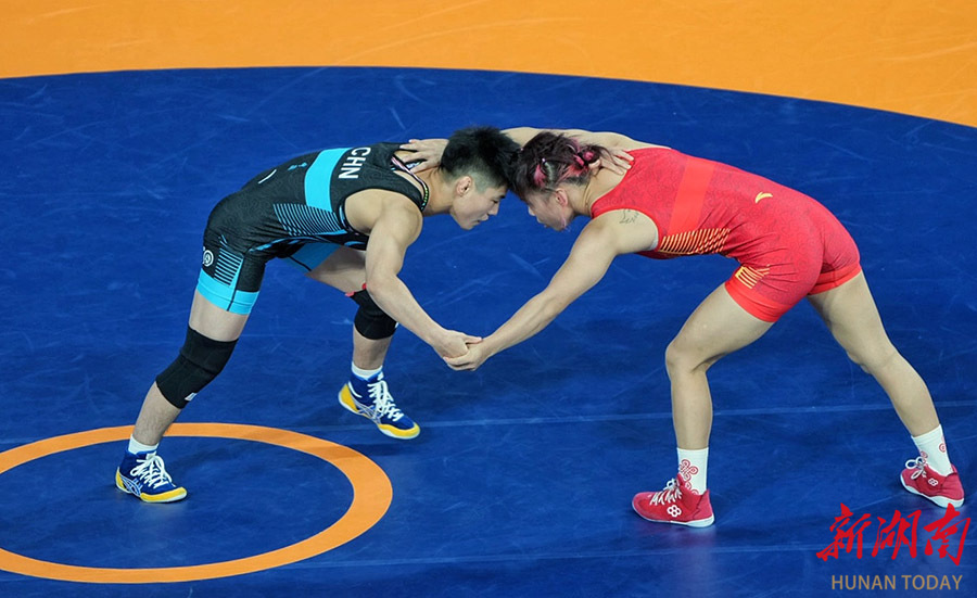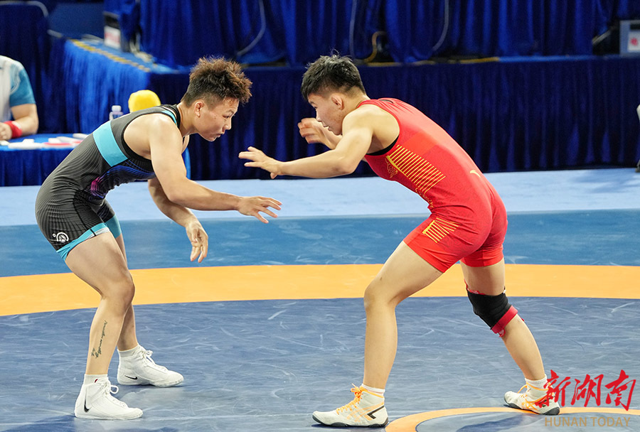 11月10日,在清远进行的第十五届全运会摔跤女子53公斤级决赛中,湘潭妹子庞倩玉(右)遗憾不敌江苏选手张金,收获一枚银牌。 湖南日报全媒体记者 傅聪 摄