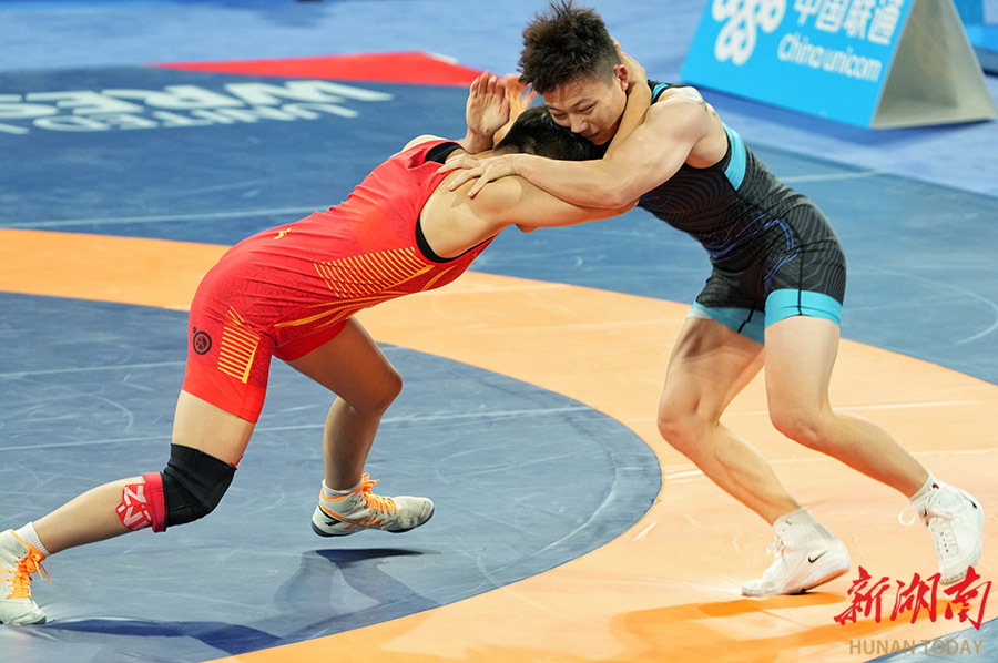 11月10日,在清远进行的第十五届全运会摔跤女子53公斤级决赛中,湘潭妹子庞倩玉(左)遗憾不敌江苏选手张金,收获一枚银牌。 湖南日报全媒体记者 傅聪 摄