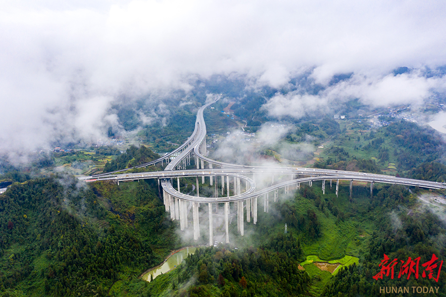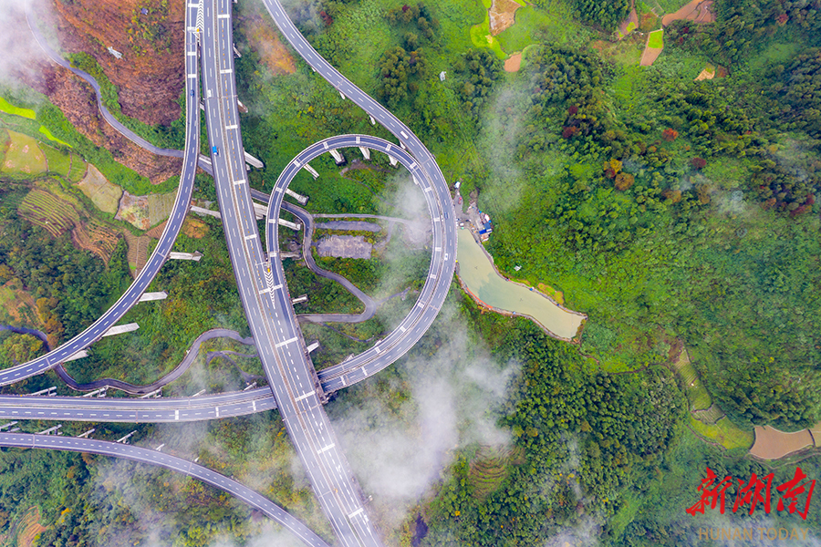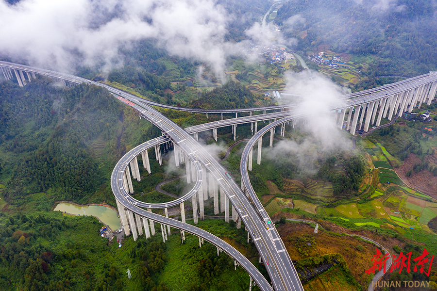 11月10日,吉首市石家冲街道,石家寨互通立交桥周边,高速公路穿行于云雾缭绕的峡谷峰峦间,时隐时现,构成一幅气势磅礴的山水画卷。 刘振军 摄(湖南图片库)