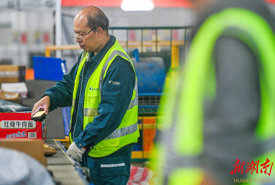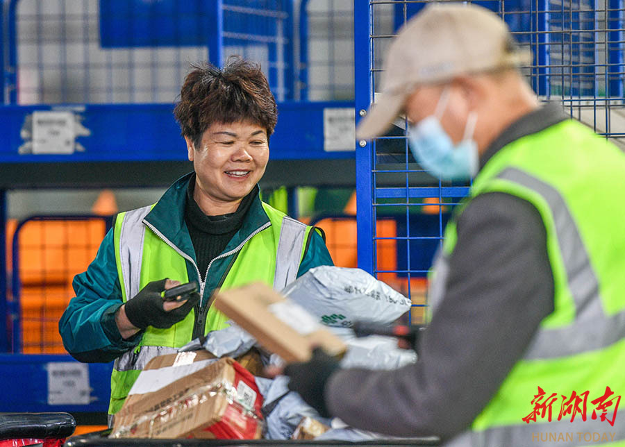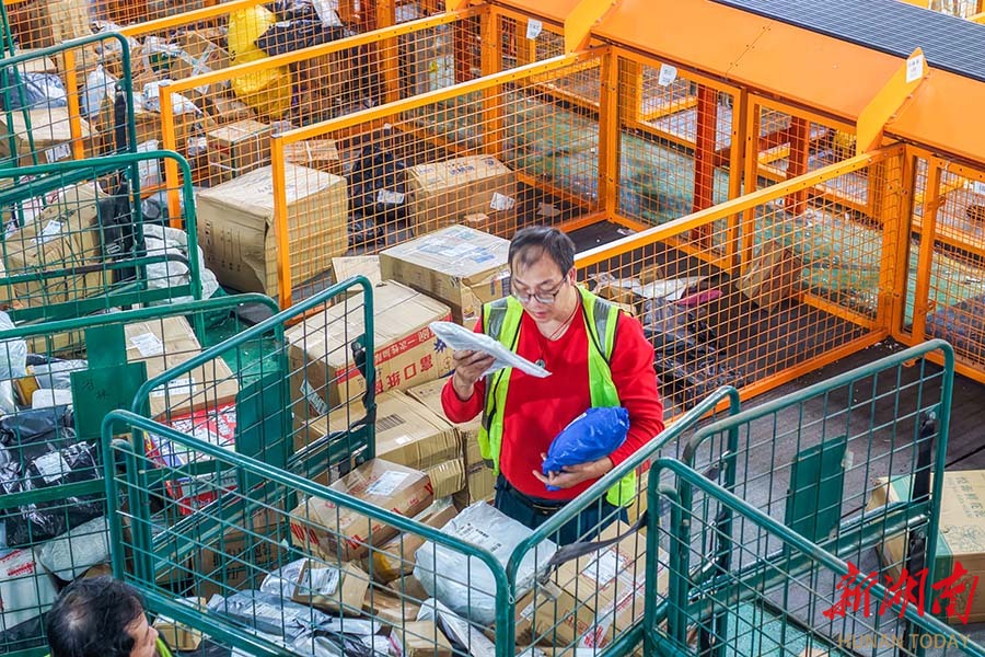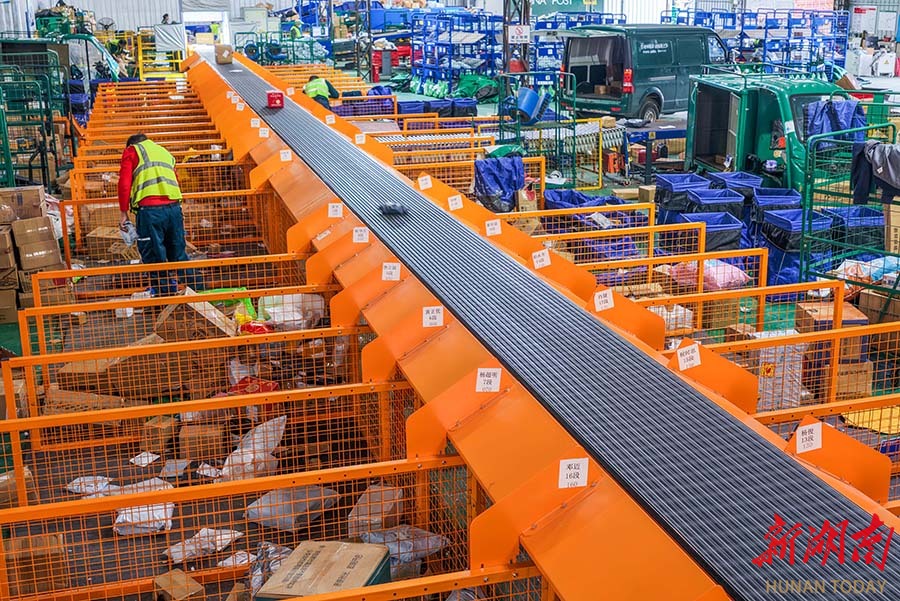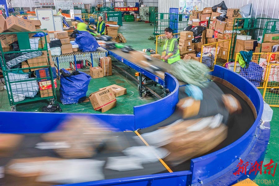 11月10日,中国邮政集团有限公司道县分公司邮件处理中心,工作人员在流水线上分拣快递包裹。连日来,道县快递物流企业结合实际情况,通过智能系统升级、人力调配等措施,确保快递物流高效运转,应对电商购物高峰。 蒋克青 摄(湖南图片库)
