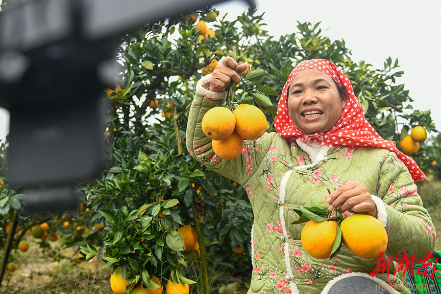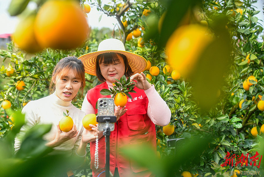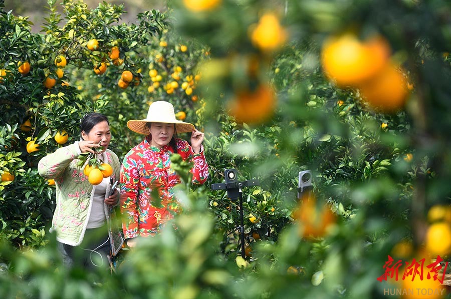 11月10日,道县东门街道新立村,主播在果园直播销售脐橙。近年来,该县创新“电商+基地+农户”模式,通过直播带货等数字化营销手段,有效拓宽销售渠道,助力果农增收致富。 蒋克青 摄(湖南图片库)