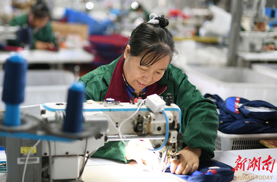 11月10日,城步产业开发区七七科技有限公司,员工在制作背包。“双十一”将近,该县各电商企业开足马力生产,加班赶制订单产品,确保电商大促期间货源充足、供应稳定。 严钦龙 摄(湖南图片库)