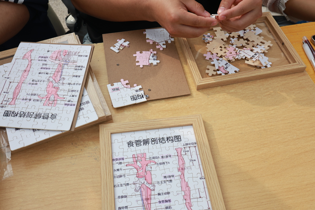 人体器官拼图环节则极具挑战性,考验同学们对解剖结构的掌握程度与空间思维能力。面对零散的器官图块,同学们从最初的困惑逐渐转为专注,依托课堂所学,积极探讨器官之间的位置关系,逐步构建出完整的人体结构图谱。这一过程不仅巩固了解剖学知识,更培养了系统思维与团队协作能力,使抽象知识在互动中化为立体认知。