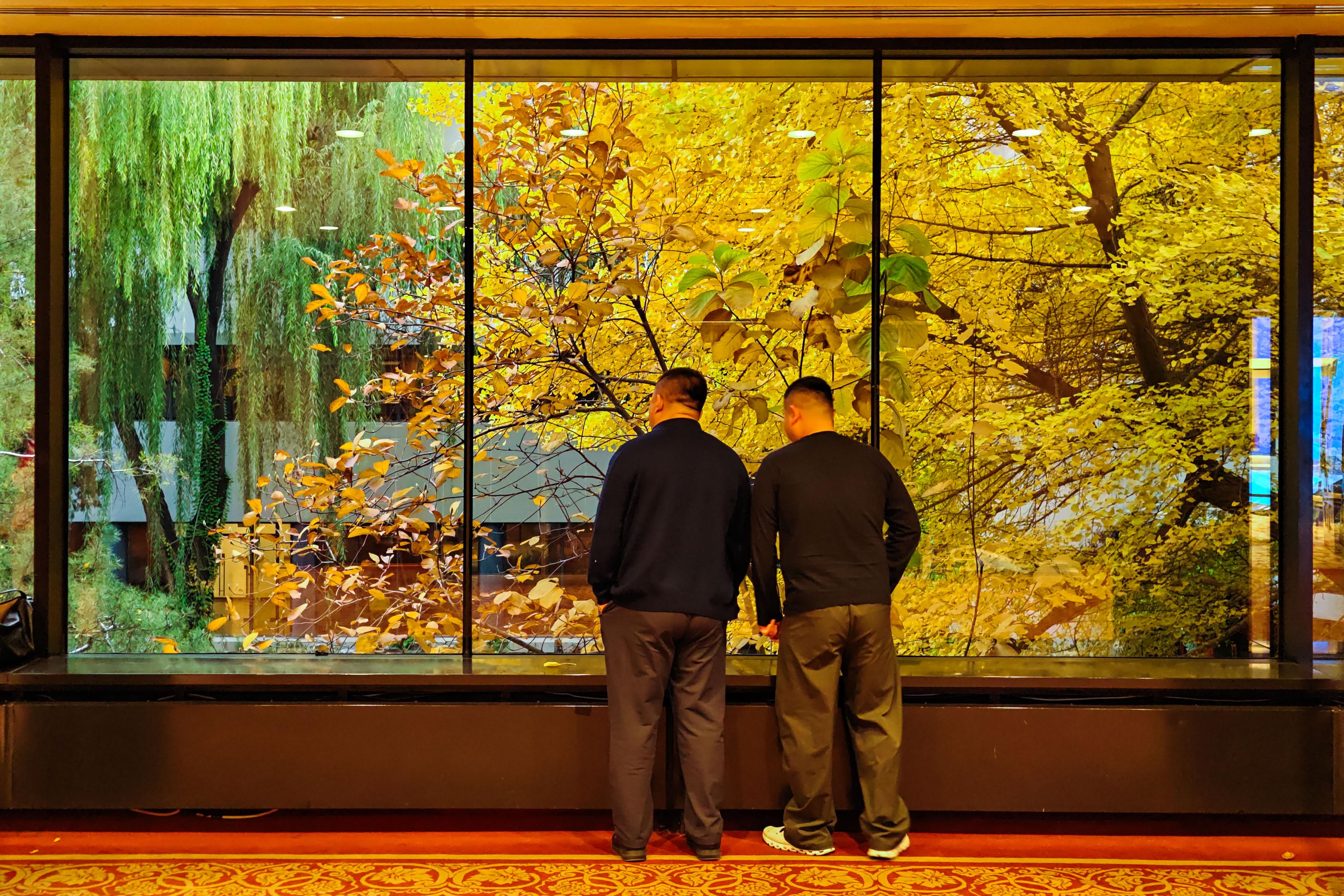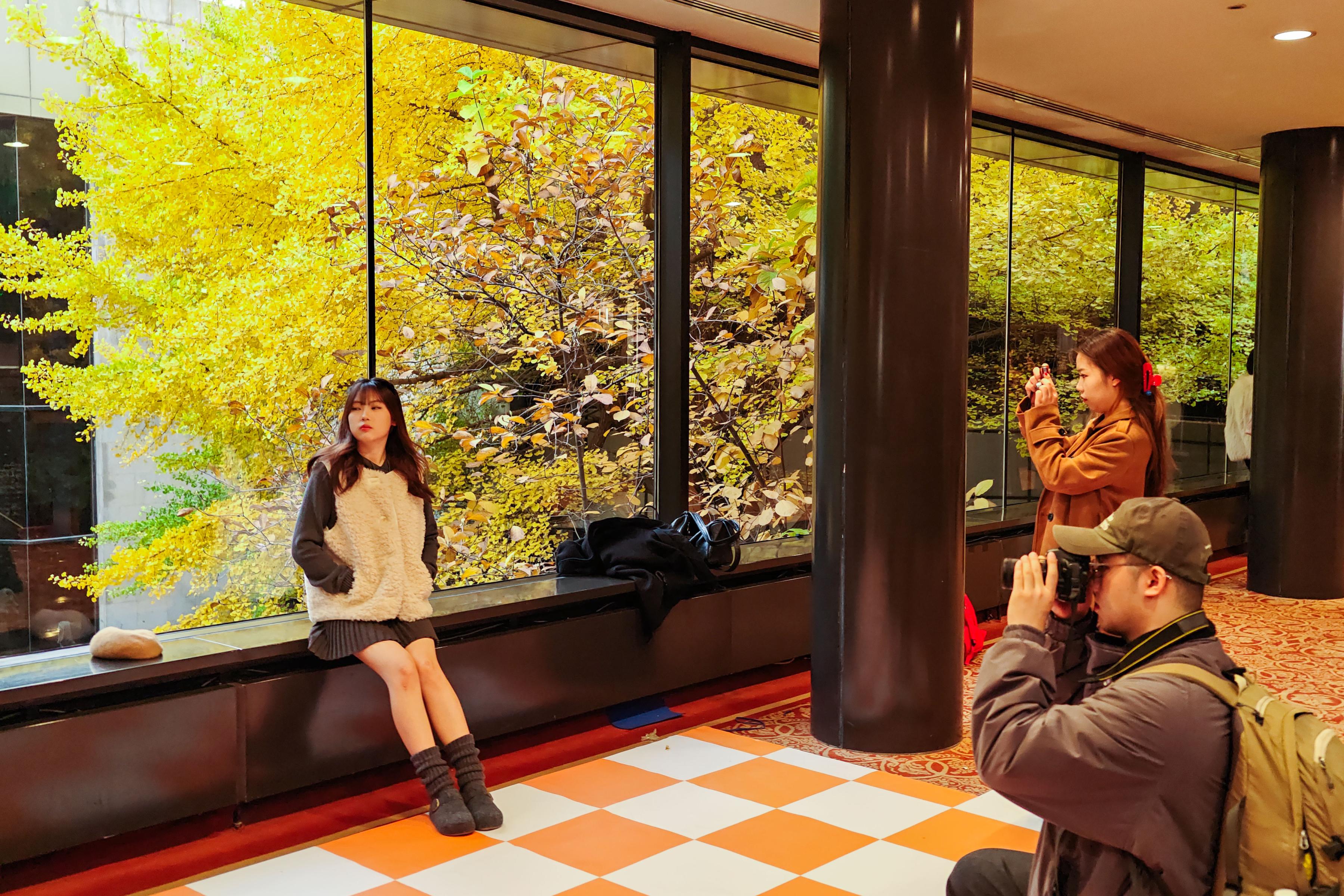 随着天气变化,京城各处的银杏陆续进入最佳观赏期,在首都宾馆走廊的“银杏之窗”,不少市民如约前来欣赏一年一度的“金色画卷”。