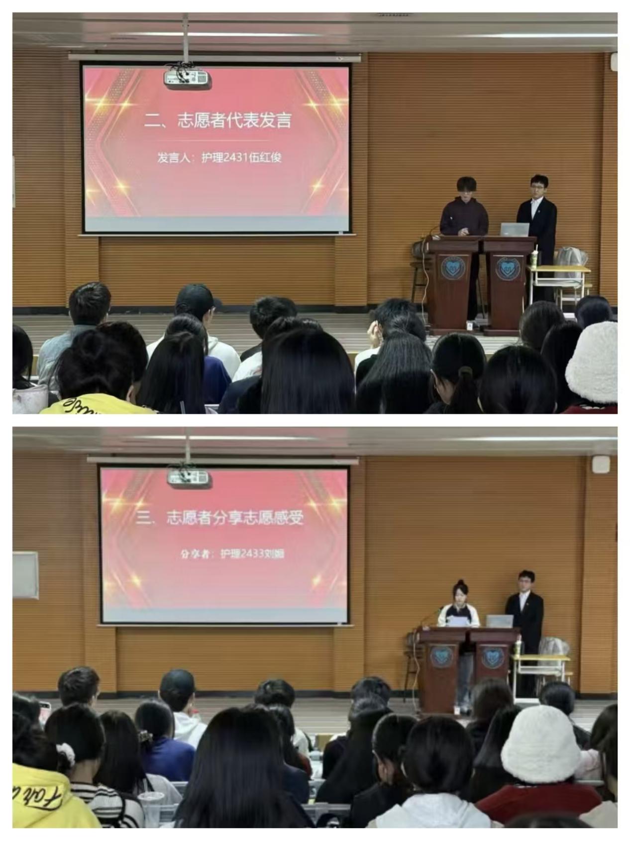 随后,优秀志愿者代表依次上台分享志愿感悟。护理2431班伍红俊讲述了自己帮助一位独自就诊的冠心病老奶奶的经历。从挂号、检查到取药,他全程耐心陪伴指引。“这次经历让我深刻体会到,‘爱众亲仁,博学笃行’的校训更需要我们在服务大众的实践中亲身践行。”他朴实真挚的分享,传递出青年医学生的温度与情怀。护理2433班刘媚则从专业视角出发,强调医护工作者需同时关注患者的显性与隐性需求,“一句关心的问候、一次耐心的解释,都能为患者带去温暖与力量。”她呼吁更多同学加入志愿行列,在服务中锤炼专业素养、践行医者使命。