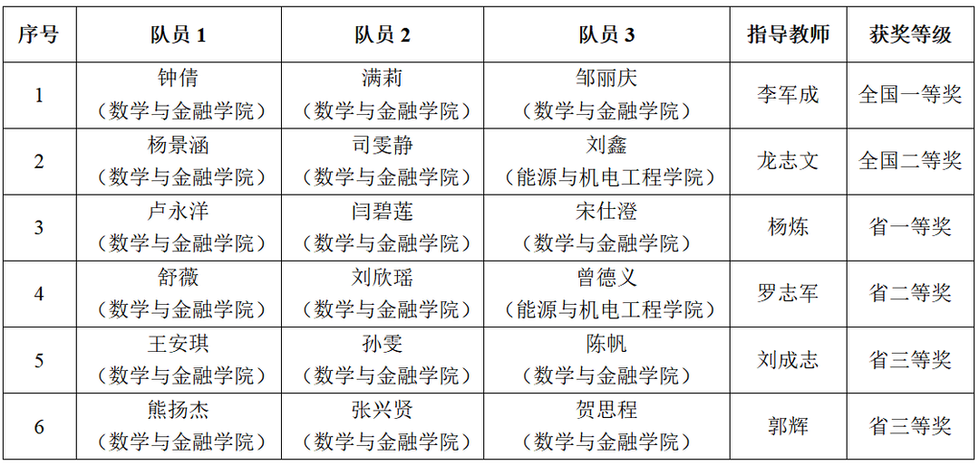 湖南日报·新湖南客户端11月13日讯(通讯员 杨炼)11月12日,2025年全国大学生数学建模竞赛获奖名单公布,由湖南人文科技学院李军成老师指导,钟倩、满莉、邹丽庆组成的参赛队伍荣获全国一等奖,龙志文老师指导,杨景涵、司雯静、刘鑫组成的参赛队伍荣获全国二等奖。此外,该校还获得湖南赛区一等奖1项、二等奖1项、三等奖2项。