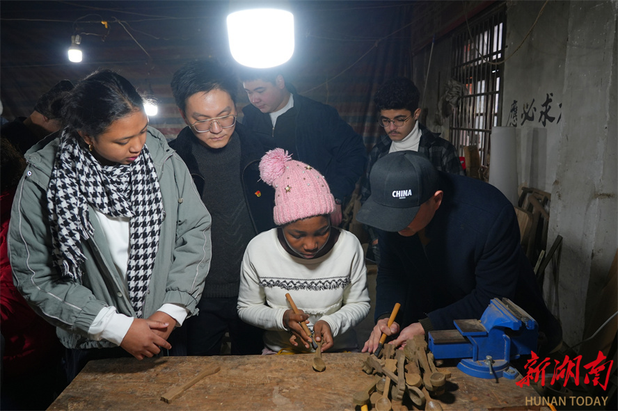 作为推动国际文化交流的重要部门,国际教育学院以“走读中国”文化研学活动为抓手,组织留学生走进常德市桃源非遗木雕工坊,开启沉浸式的中国传统文化之旅。在“桃源木雕”非遗传承人肖修鸿大师耐心指导下,留学生们近距离观察木雕工具的使用技巧,触摸细腻的木质纹理,聆听木雕作品背后的历史故事与文化寓意。