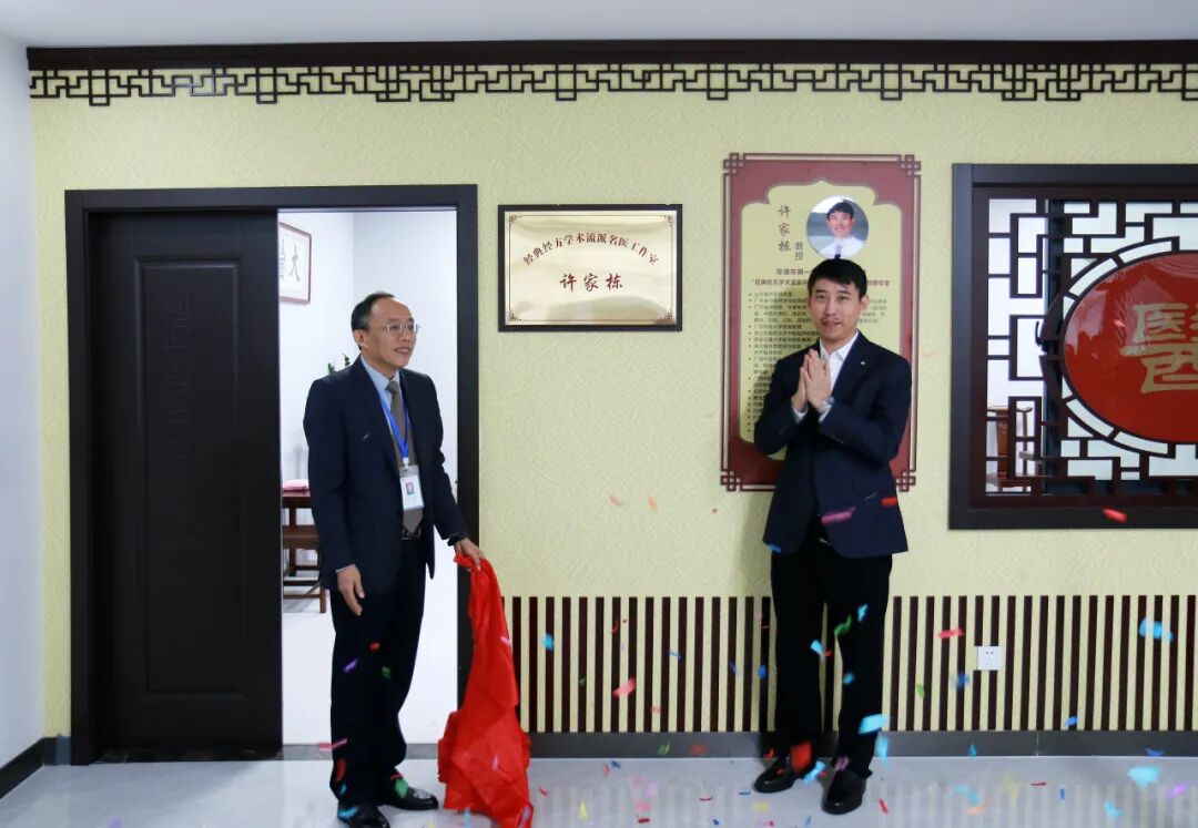 常德市第一中医医院党委书记屈贵顺(左)、许家栋教授(右)共同为“经典经方学术流派许家栋名医工作室”揭牌。