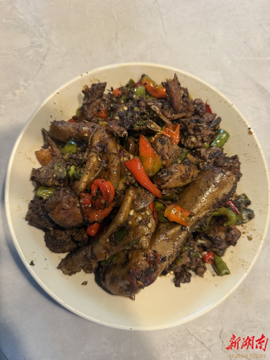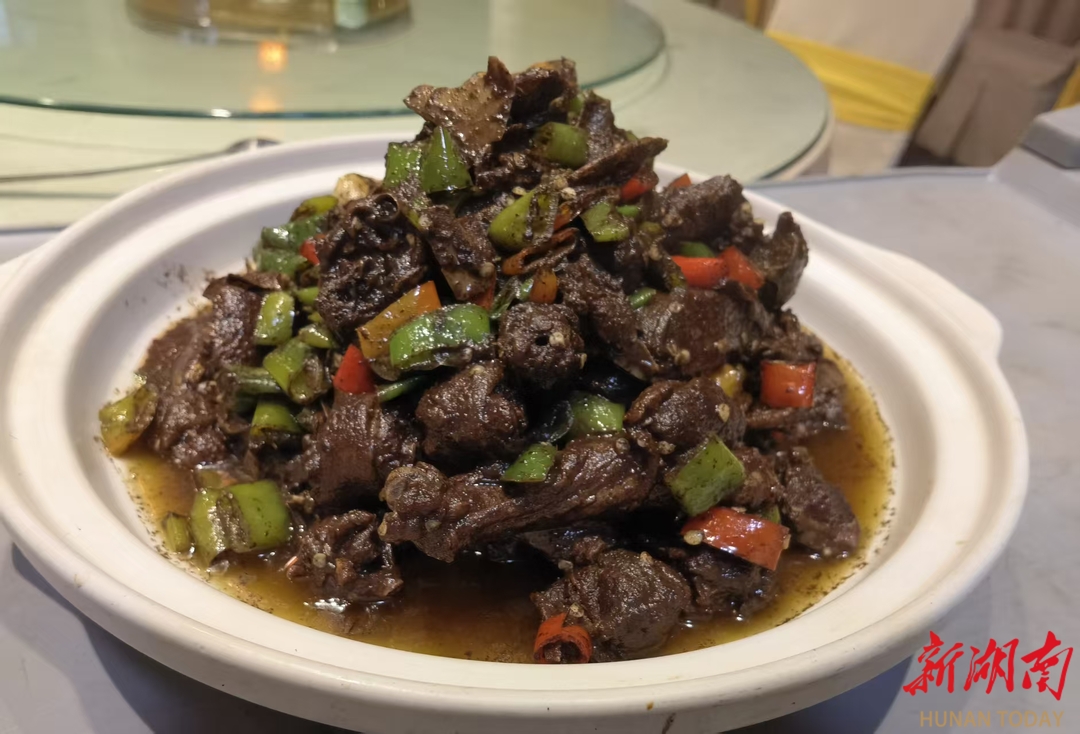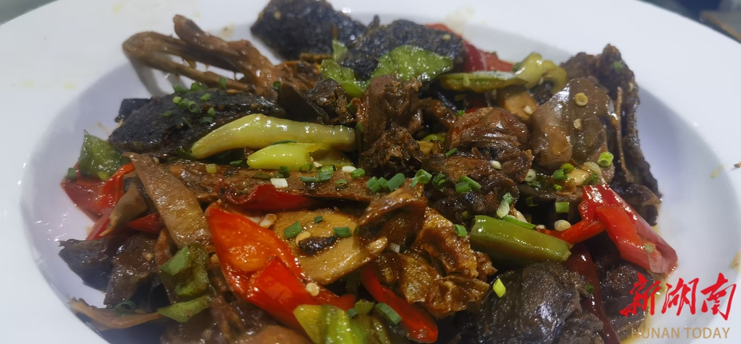 辰溪血鸭,又是辰溪菜中一绝。选料是乡下吃谷子的仔鸭,制作时将鸭血与鸭子肉一道爆炒,拌以飞辣的青辣椒。这里炒熟的鸭子是绝对飞不走的,鸭肉中绞有乌青色的血丝,如葱郁的原野上盛开细碎的小野花点缀其间,扑面而来散发阵阵自然而清淡的诱人芳香。因鸭血从起始就被炒进鸭肉里,这道辰溪血鸭看上去不是很美观,颜色黝黑,稠糊如雾。