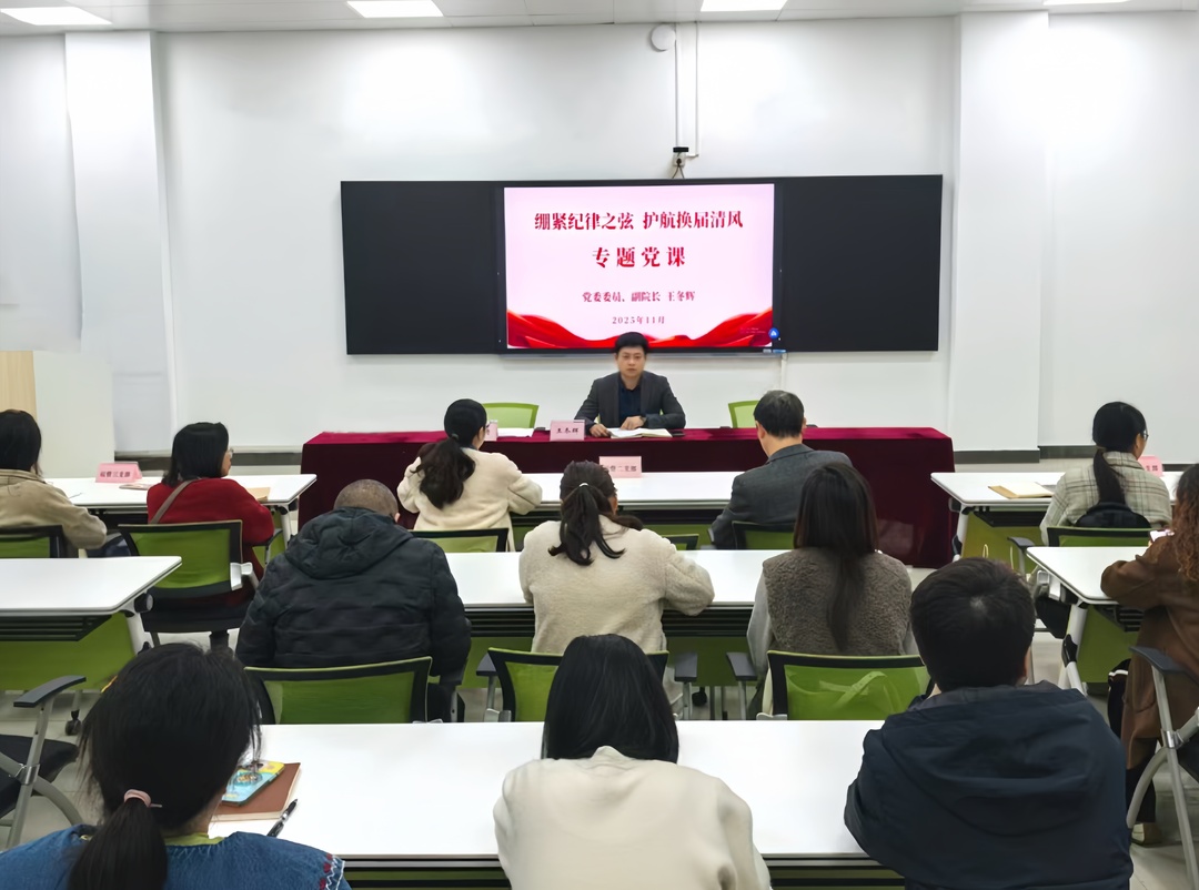 王冬辉认真听取了总结报告,对本次系列活动的精心组织、丰富内容和显著成效给予了充分肯定和高度评价。他指出,此次活动构建了横向到边、纵向到底的全方位体系,实现了廉洁教育“面上覆盖”与“点上发力”的有机统一。他以“绷紧纪律之弦 护航换届清风”为主题,为党总支全体党员讲授了一堂生动深刻的廉洁教育专题党课,要求全体党员提高政治站位,筑牢思想防线,严守纪律规矩,主动担当作为,用风清气正的换届生态护航学院高质量发展,续写内涵建设与特色发展的新篇章。(汪洋)