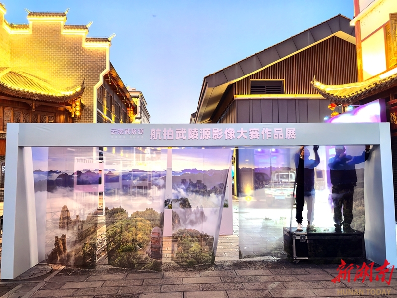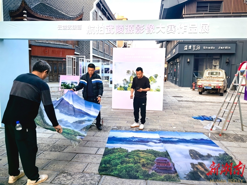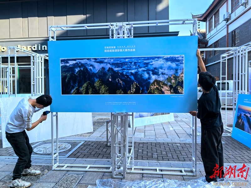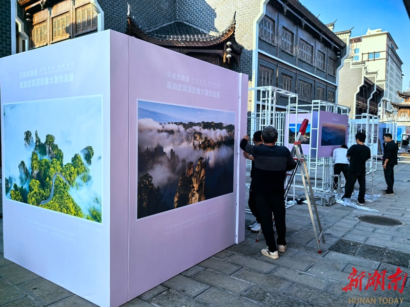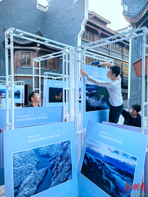 11月14日,张家界市大庸古城,工作人员在布展。由湖南日报社、张家界市武陵源区人民政府、张家界武陵源风景名胜区和国家森林公园管理局主办的“云端武陵源——航拍武陵源影像大赛作品展”将于11月16日在张家界市大庸古城正式开展。湖南日报全媒体记者 郭立亮 通讯员 吴勇兵 摄影报道